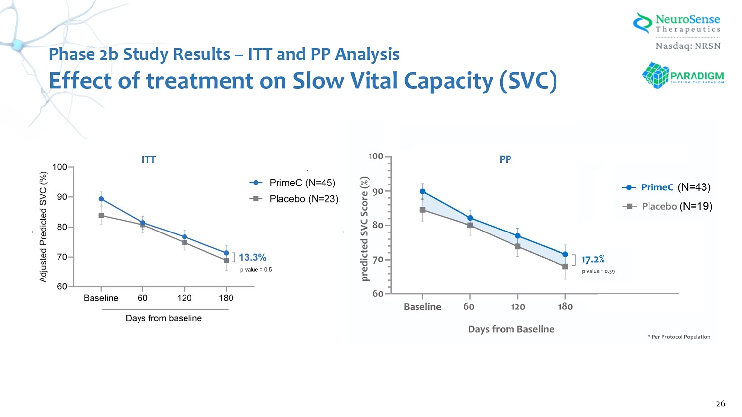 Phase 2 b Study Results – PP Analysis PrimeC Slowed Decline of Physical Functions vs Placebo - 2.51 - 1.99 -4 -3 -2 -1 0 Number of Points Lost Fine Motor 0.52 Point Difference (P= 0.42 ) - 1.36 - 0.83 -4 -3 -2 -1 0 Number of Points Lost Bulbar 0.53 Point Difference (P= 0.16 ) - 2.94 - 2.10 -4 -3 -2 -1 0 Number of Points Lost Gross Motor 0.84 Point Difference (P= 0.14 ) - 1.71 - 0.57 -4 -3 -2 -1 0 Number of Points Lost Respiratory 1.14 Point Difference (P=0.04) 25 Background Respiratory failure is the most common cause of death from ALS Bulbar: Speech Salivation Swallowing Respiratory: Dyspnea Orthopnea Respiratory insufficiency Fine Motor: Handwriting Cutting Food Dressing and hygiene Gross Motor: Turning in bed Walking Climbing stairs Placebo PrimeC