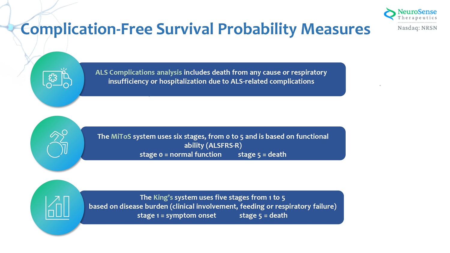 Complication - Free Survival Probability Measures ALS Complications analysis includes death from any cause or respiratory insufficiency or hospitalization due to ALS - related complications The MiToS system uses six stages, from 0 to 5 and is based on functional ability (ALSFRS - R) stage 0 = normal function stage 5 = death The King ’ s system uses five stages from 1 to 5 based on disease burden (clinical involvement, feeding or respiratory failure) stage 1 = symptom onset stage 5 = death
