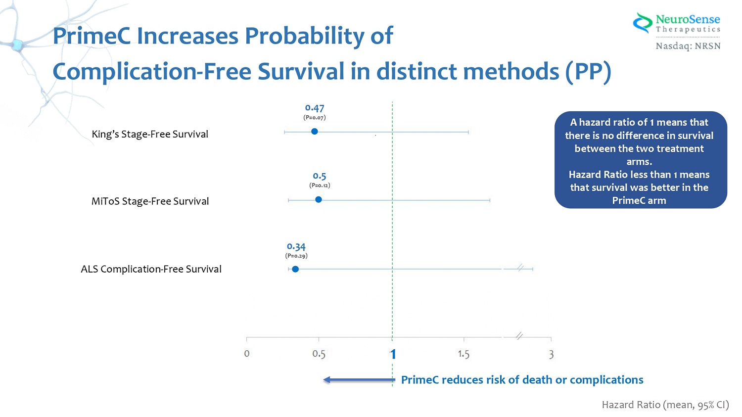 PrimeC Increases Probability of Complication - Free Survival in distinct methods (ITT) Hazard Ratio (mean, 95% CI) King ’ s Stage - Free Survival MiToS Stage - Free Survival ALS Complication - Free Survival PrimeC reduces risk of death or complications 1 A hazard ratio of 1 means that there is no difference in survival between the two treatment arms. Hazard Ratio less than 1 means that survival was better in the PrimeC arm 0.52 (P= 0.1 ) 0.65 (P=0.31) 0.7 (P= 0.69 )