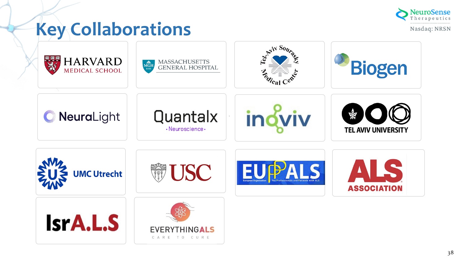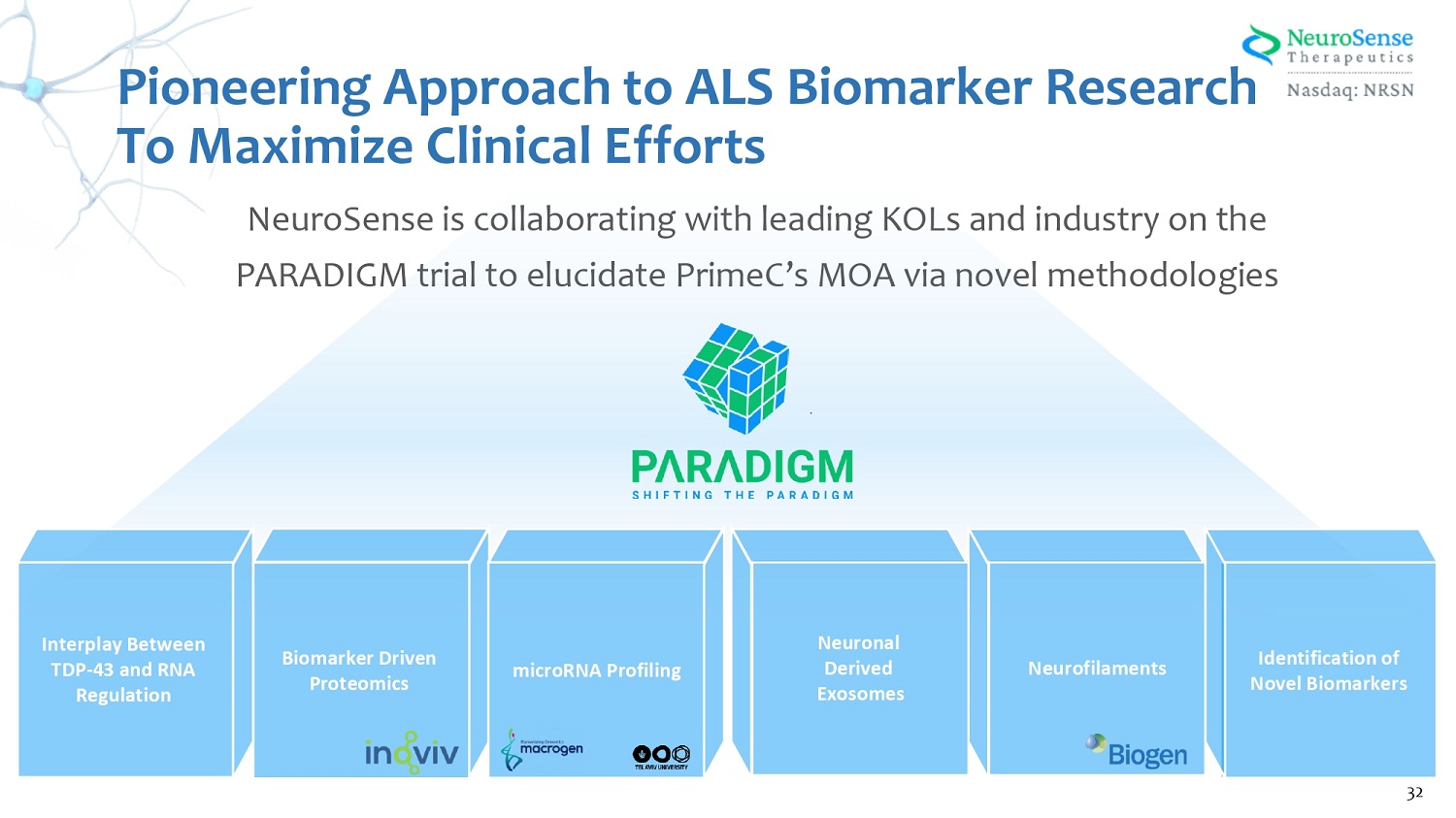 NeuroSense is collaborating with leading KOLs and industry on the PARADIGM trial to elucidate PrimeC ’ s MOA via novel methodologies Biomarker Driven Proteomics Interplay Between TDP - 43 and RNA Regulation microRNA Profiling Identification of Novel Biomarkers Neurofilaments Neuronal Derived Exosomes Pioneering Approach to ALS Biomarker Research To Maximize Clinical Efforts 32