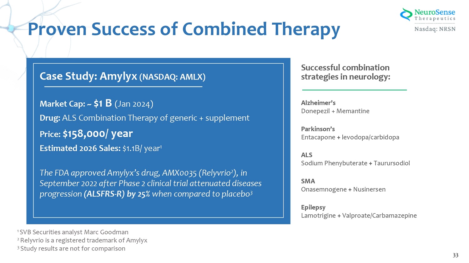 Alzheimer ’ s Donepezil + Memantine Parkinson ’ s Entacapone + levodopa/carbidopa ALS Sodium Phenybuterate + Taurursodiol SMA Onasemnogene + Nusinersen Epilepsy Lamotrigine + Valproate/Carbamazepine Successful combination strategies in neurology: Case Study: Amylyx (NASDAQ: AMLX) Market Cap: ~ $1 B (Jan 2024) Drug: ALS Combination Therapy of generic + supplement Price: $158,000/ year Estimated 2026 Sales: $1.1B/ year 1 The FDA approved Amylyx’s drug, AMX0035 (Relyvrio 2 ), in September 2022 after Phase 2 clinical trial attenuated diseases progression (ALSFRS - R) by 25% when compared to placebo 3 1 SVB Securities analyst Marc Goodman 2 Relyvrio is a registered trademark of Amylyx 3 Study results are not for comparison Proven Success of Combined Therapy 33
