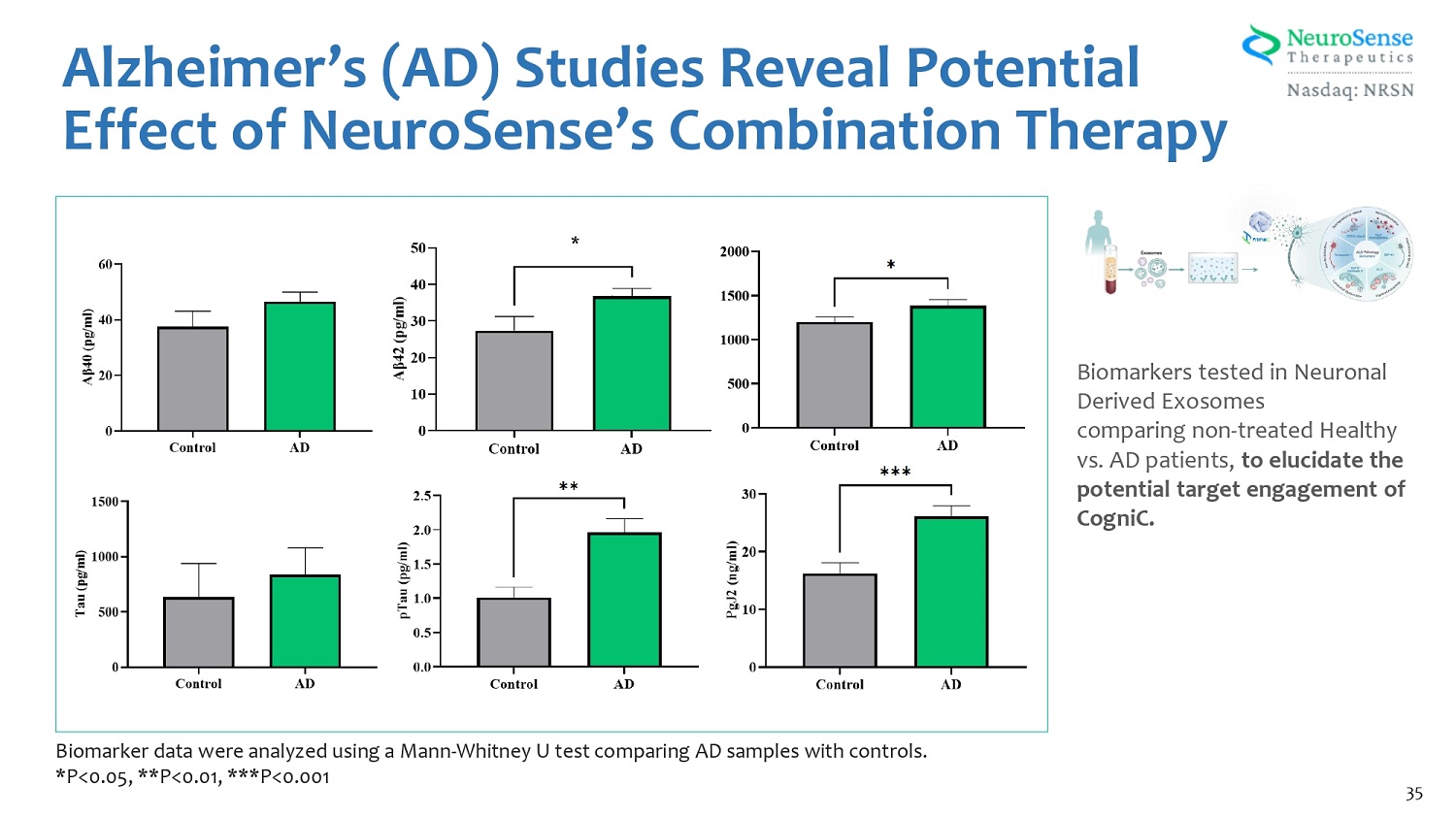 Alzheimer ’ s (AD) Studies Reveal Potential Effect of NeuroSense ’ s Combination Therapy Biomarkers tested in Neuronal Derived Exosomes comparing non - treated Healthy vs. AD patients, to elucidate the potential target engagement of CogniC. Biomarker data were analyzed using a Mann - Whitney U test comparing AD samples with controls . *P< 0 . 05 , **P< 0 . 01 , ***P< 0 . 001 * 35