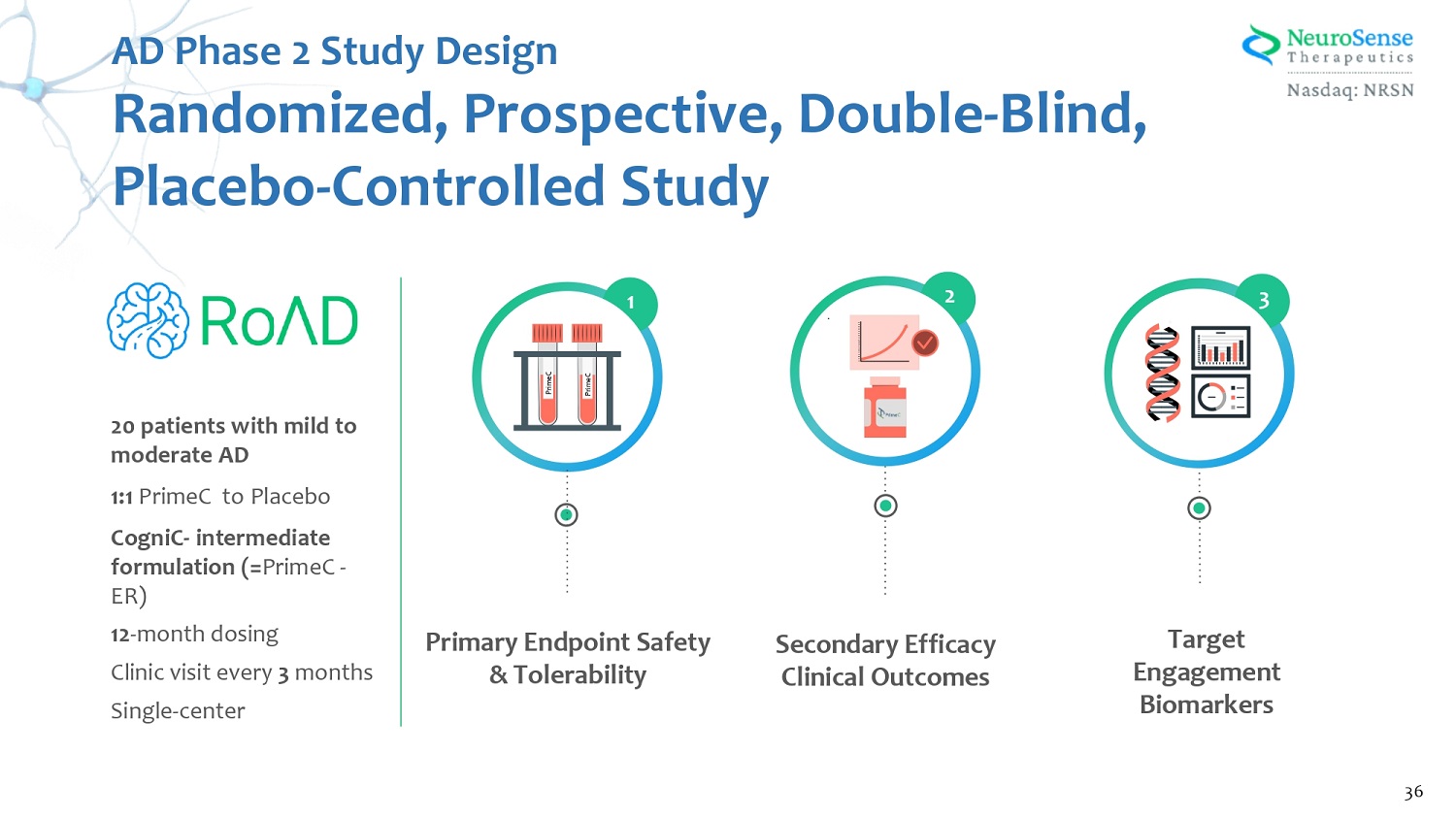 20 patients with mild to moderate AD 1:1 PrimeC to Placebo CogniC - intermediate formulation (= PrimeC - ER) 12 - month dosing Clinic visit every 3 months Single - center Target Engagement Biomarkers Secondary Efficacy Clinical Outcomes Primary Endpoint Safety & Tolerability 3 1 PrimeC PrimeC 2 AD Phase 2 Study Design Randomized, Prospective, Double - Blind, Placebo - Controlled Study 36