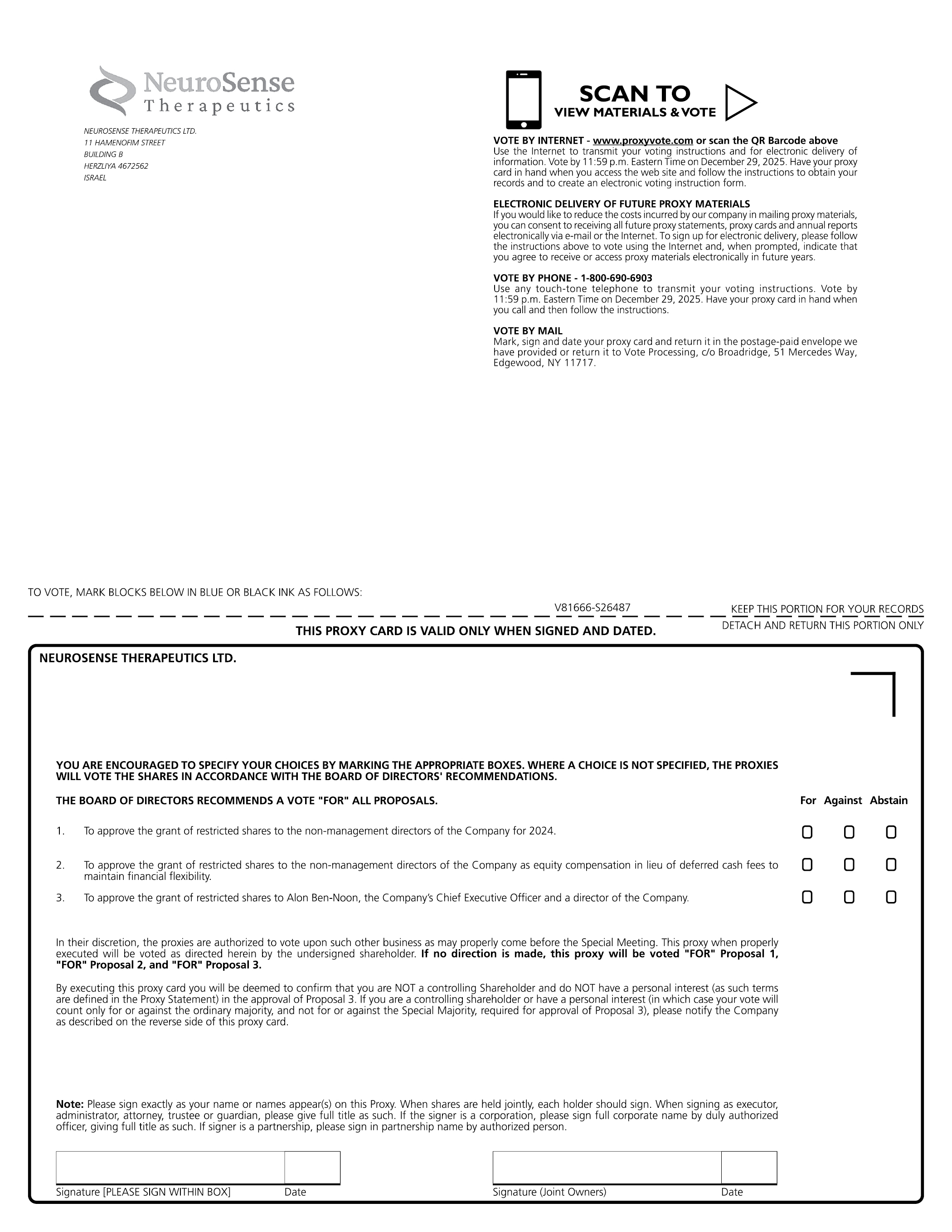 NEUROSENSE THERAPEUTICS LTD. 11 HAMENOFIM STREET BUILDING B HERZLIYA 4672562 ISRAEL SCAN TO VIEW MATERIALS & VOTE VOTE BY INTERNET - www.proxyvote.com or scan the QR Barcode above Use the Internet to transmit your voting instructions and for electronic delivery of information. Vote by 11:59 p.m. Eastern Time on December 29, 2025. Have your proxy card in hand when you access the web site and follow the instructions to obtain your records and to create an electronic voting instruction form. ELECTRONIC DELIVERY OF FUTURE PROXY MATERIALS If you would like to reduce the costs incurred by our company in mailing proxy materials, you can consent to receiving all future proxy statements, proxy cards and annual reports electronically via e-mail or the Internet. To sign up for electronic delivery, please follow the instructions above to vote using the Internet and, when prompted, indicate that you agree to receive or access proxy materials electronically in future years. VOTE BY PHONE - 1-800-690-6903 Use any touch-tone telephone to transmit your voting instructions. Vote by 11:59 p.m. Eastern Time on December 29, 2025. Have your proxy card in hand when you call and then follow the instructions. VOTE BY MAIL Mark, sign and date your proxy card and return it in the postage-paid envelope we have provided or return it to Vote Processing, c/o Broadridge, 51 Mercedes Way, Edgewood, NY 11717. TO VOTE, MARK BLOCKS BELOW IN BLUE OR BLACK INK AS FOLLOWS: V81666-S26487 KEEP THIS PORTION FOR YOUR RECORDS DETACH AND RETURN THIS PORTION ONLY THIS PROXY CARD IS VALID ONLY WHEN SIGNED AND DATED. NEUROSENSE THERAPEUTICS LTD. YOU ARE ENCOURAGED TO SPECIFY YOUR CHOICES BY MARKING THE APPROPRIATE BOXES. WHERE A CHOICE IS NOT SPECIFIED, THE PROXIES WILL VOTE THE SHARES IN ACCORDANCE WITH THE BOARD OF DIRECTORS’ RECOMMENDATIONS. THE BOARD OF DIRECTORS RECOMMENDS A VOTE “FOR” ALL PROPOSALS. 1. To approve the grant of restricted shares to the non-management directors of the Company for 2024. 2. To approve the grant of restricted shares to the non-management directors of the Company as equity compensation in lieu of deferred cash fees to maintain financial flexibility. 3. To approve the grant of restricted shares to Alon Ben-Noon, the Company’s Chief Executive Officer and a director of the Company. In their discretion, the proxies are authorized to vote upon such other business as may properly come before the Special Meeting. This proxy when properly executed will be voted as directed herein by the undersigned shareholder. If no direction is made, this proxy will be voted “FOR” Proposal 1, “FOR” Proposal 2, and “FOR” Proposal 3. By executing this proxy card you will be deemed to confirm that you are NOT a controlling Shareholder and do NOT have a personal interest (as such terms are defined in the Proxy Statement) in the approval of Proposal 3. If you are a controlling shareholder or have a personal interest (in which case your vote will count only for or against the ordinary majority, and not for or against the Special Majority, required for approval of Proposal 3), please notify the Company as described on the reverse side of this proxy card. Note: Please sign exactly as your name or names appear(s) on this Proxy. When shares are held jointly, each holder should sign. When signing as executor, administrator, attorney, trustee or guardian, please give full title as such. If the signer is a corporation, please sign full corporate name by duly authorized officer, giving full title as such. If signer is a partnership, please sign in partnership name by authorized person. Signature [PLEASE SIGN WITHIN BOX] Date Signature (Joint Owners) Date For Against Abstain
