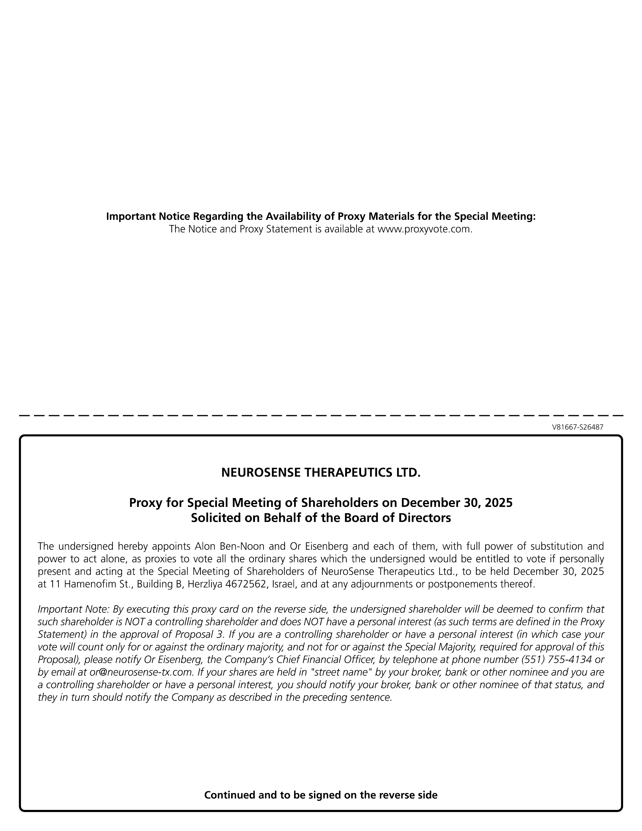 Important Notice Regarding the Availability of Proxy Materials for the Special Meeting:The Notice and Proxy Statement is available at www.proxyvote.com. V81667-S26487 NEUROSENSE THERAPEUTICS LTD. Proxy for Special Meeting of Shareholders on December 30, 2025 Solicited on Behalf of the Board of Directors The undersigned hereby appoints Alon Ben-Noon and Or Eisenberg and each of them, with full power of substitution and power to act alone, as proxies to vote all the ordinary shares which the undersigned would be entitled to vote if personally present and acting at the Special Meeting of Shareholders of NeuroSense Therapeutics Ltd., to be held December 30, 2025 at 11 Hamenofim St., Building B, Herzliya 4672562, Israel, and at any adjournments or postponements thereof. Important Note: By executing this proxy card on the reverse side, the undersigned shareholder will be deemed to confirm that such shareholder is NOT a controlling shareholder and does NOT have a personal interest (as such terms are defined in the Proxy Statement) in the approval of Proposal 3. If you are a controlling shareholder or have a personal interest (in which case your vote will count only for or against the ordinary majority, and not for or against the Special Majority, required for approval of this Proposal), please notify Or Eisenberg, the Company’s Chief Financial Officer, by telephone at phone number (551) 755-4134 or by email at or@neurosense-tx.com. If your shares are held in “street name” by your broker, bank or other nominee and you are a controlling shareholder or have a personal interest, you should notify your broker, bank or other nominee of that status, and they in turn should notify the Company as described in the preceding sentence. Continued and to be signed on the reverse side