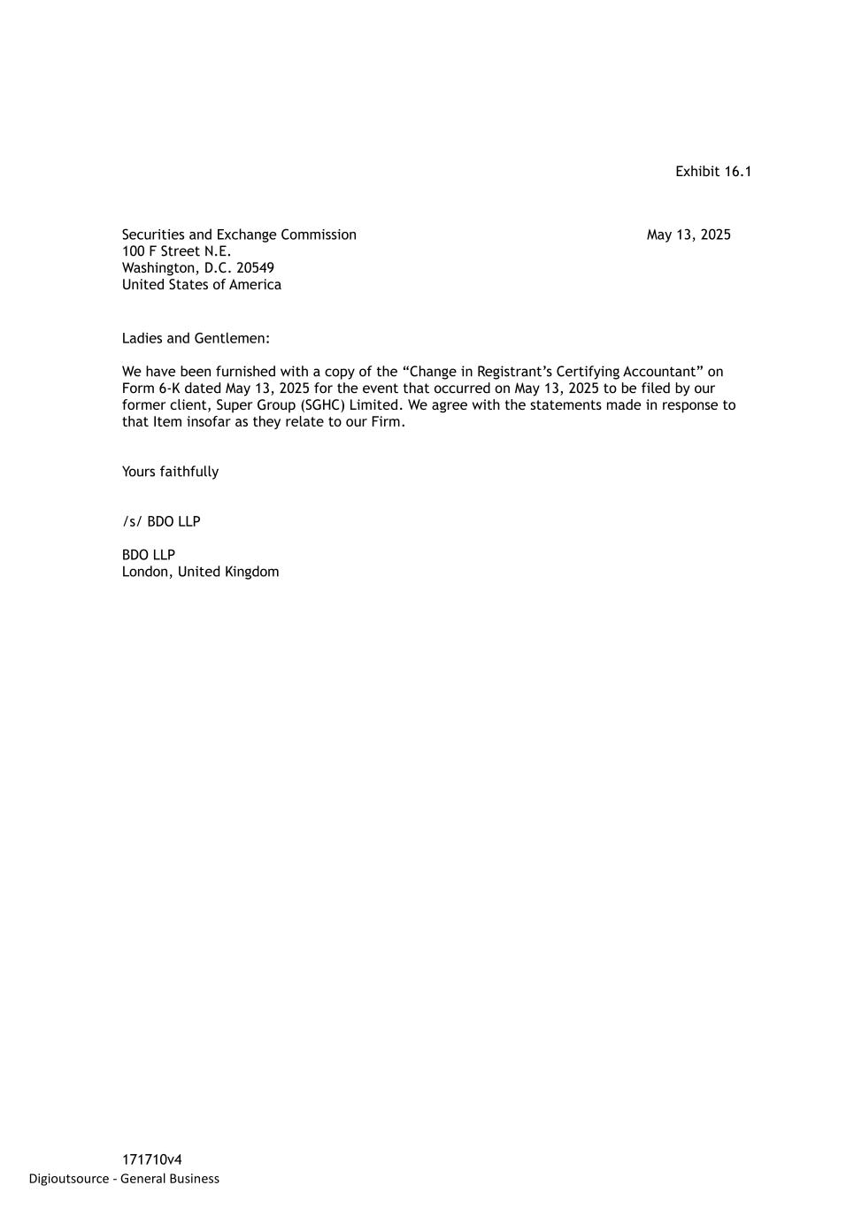 171710v4 Digioutsource - General Business Exhibit 16.1 Securities and Exchange Commission 100 F Street N.E. Washington, D.C. 20549 United States of America May 13, 2025 Ladies and Gentlemen: We have been furnished with a copy of the “Change in Registrant’s Certifying Accountant” on Form 6-K dated May 13, 2025 for the event that occurred on May 13, 2025 to be filed by our former client, Super Group (SGHC) Limited. We agree with the statements made in response to that Item insofar as they relate to our Firm. Yours faithfully /s/ BDO LLP BDO LLP London, United Kingdom
