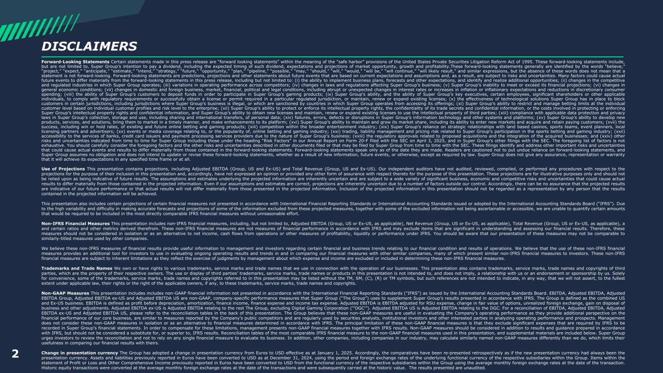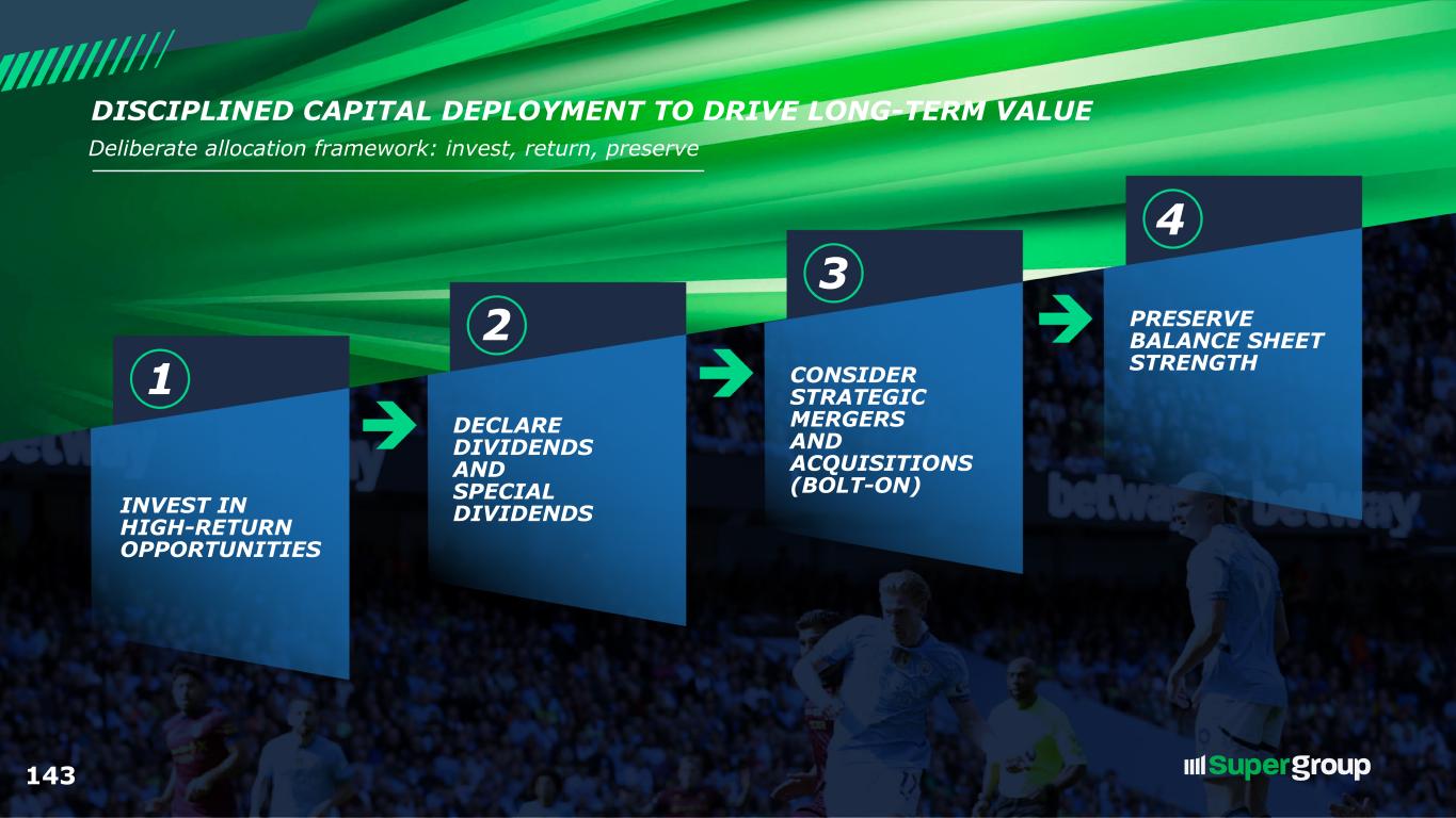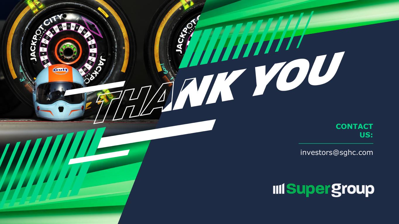 Forward-Looking Statements Certain statements made in this press release are “forward looking statements” within the meaning of the “safe harbor” provisions of the United States Private Securities Litigation Reform Act of 1995. These forward-looking statements include, but are not limited to, Super Group’s intention to pay a dividend, including the expected timing of such dividend, expectations and projections of market opportunity, growth and profitability.These forward-looking statements generally are identified by the words “believe,” “project,” “expect,” “anticipate,” “estimate,” “intend,” “strategy,” “future,” “opportunity,” “plan,” “pipeline,” “possible,” “may,” “should,” “will,” “would,” “will be,” “will continue,” “will likely result,” and similar expressions, but the absence of these words does not mean that a statement is not forward-looking. Forward-looking statements are predictions, projections and other statements about future events that are based on current expectations and assumptions and, as a result, are subject to risks and uncertainties. Many factors could cause actual future events to differ materially from the forward-looking statements in this press release, including but not limited to: (i) the ability to implement business plans, forecasts and other expectations, and identify and realize additional opportunities; (ii) changes in the competitive and regulated industries in which Super Group operates; (iii) variations in operating performance across competitors; (iv) changes in laws and regulations affecting Super Group’s business; (v) Super Group’s inability to meet or exceed its financial projections; (vi) changes in general economic conditions; (vii) changes in domestic and foreign business, market, financial, political and legal conditions, including abrupt or unexpected changes in interest rates or increases in inflation or inflationary expectations and reductions in discretionary consumer spending; (viii) the ability of Super Group’s customers to deposit funds in order to participate in Super Group’s gaming products; (ix) Super Group’s ability, and the ability of Super Group’s key executives, certain employees, significant shareholders or other applicable individuals, to comply with regulatory requirements or successfully obtain a license or permit required in a particular regulated jurisdiction, or maintain, renew or expand existing licenses; (x) the effectiveness of technological solutions Super Group has in place to block customers in certain jurisdictions, including jurisdictions where Super Group’s business is illegal, or which are sanctioned by countries in which Super Group operates from accessing its offerings; (xi) Super Group’s ability to restrict and manage betting limits at the individual customer level based on individual customer profiles and risk level to the enterprise; (xii) Super Group’s ability to protect or enforce its intellectual property rights, the confidentiality of its trade secrets and confidential information, or the costs involved in protecting or enforcing Super Group’s intellectual property rights and confidential information, and Super Group’s ability to obtain new licenses and maintain, renew or expand existing licenses to use the intellectual property of third parties; (xiii) compliance with applicable data protection and privacy laws in Super Group’s collection, storage and use, including sharing and international transfers, of personal data; (xiv) failures, errors, defects or disruptions in Super Group’s information technology and other systems and platforms; (xv) Super Group’s ability to develop new products, services, and solutions, bring them to market in a timely manner, and make enhancements to its platform; (xvi) Super Group’s ability to maintain and grow its market share, including its ability to enter new markets and acquire and retain paying customers; (xvii) the success, including win or hold rates, of existing and future online betting and gaming products; (xiii) competition within the broader entertainment industry; (xix) Super Group’s reliance on strategic relationships with land based casinos, sports teams, event planners, local licensing partners and advertisers; (xx) events or media coverage relating to, or the popularity of, online betting and gaming industry; (xxi) trading, liability management and pricing risk related to Super Group’s participation in the sports betting and gaming industry; (xxii) accessibility to the services of banks, credit card issuers and payment processing services providers due to the nature of Super Group’s business; (xxiii) the regulatory approvals related to proposed acquisitions and the integration of the acquired businesses; and (xxiv) other risks and uncertainties indicated from time to time for Super Group including those under the heading “Risk Factors” in our Annual Report on Form 20-F filed with the SEC on April 3, 2025, and in Super Group’s other filings with the SEC. The foregoing list of factors is not exhaustive. You should carefully consider the foregoing factors and the other risks and uncertainties described in other documents filed or that may be filed by Super Group from time to time with the SEC. These filings identify and address other important risks and uncertainties that could cause actual events and results to differ materially from those contained in the forward-looking statements. Forward-looking statements speak only as of the date they are made. Readers are cautioned not to put undue reliance on forward-looking statements, and Super Group assumes no obligation and does not intend to update or revise these forward-looking statements, whether as a result of new information, future events, or otherwise, except as required by law. Super Group does not give any assurance, representation or warranty that it will achieve its expectat