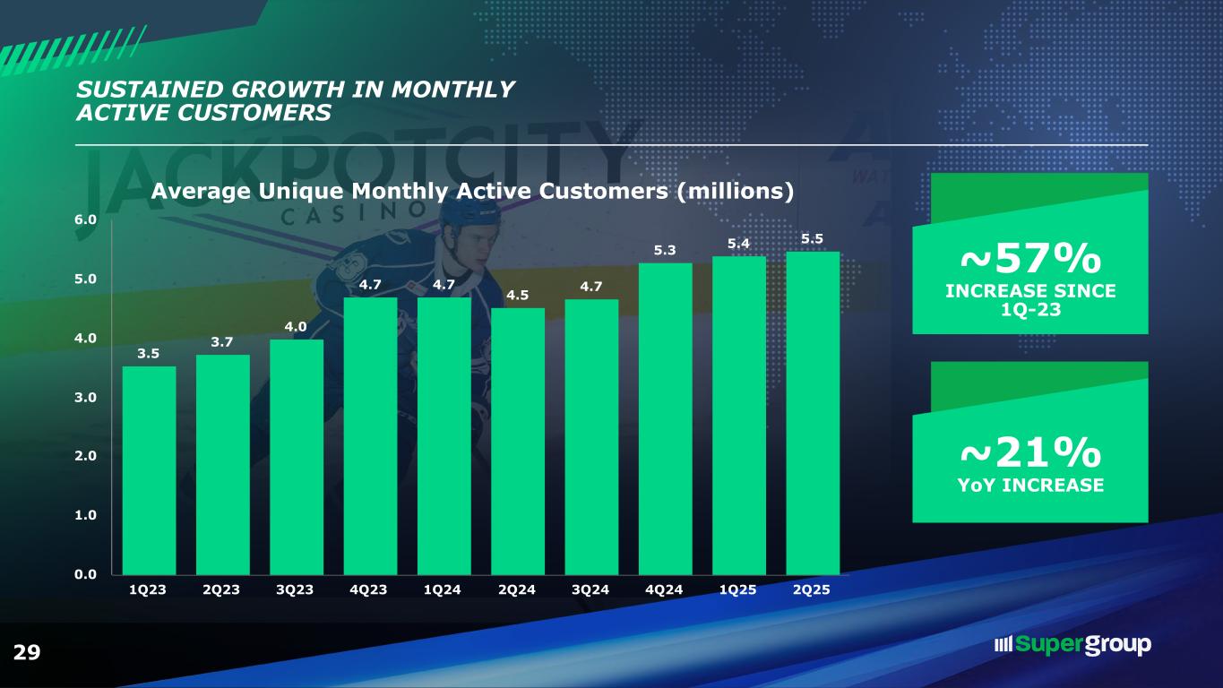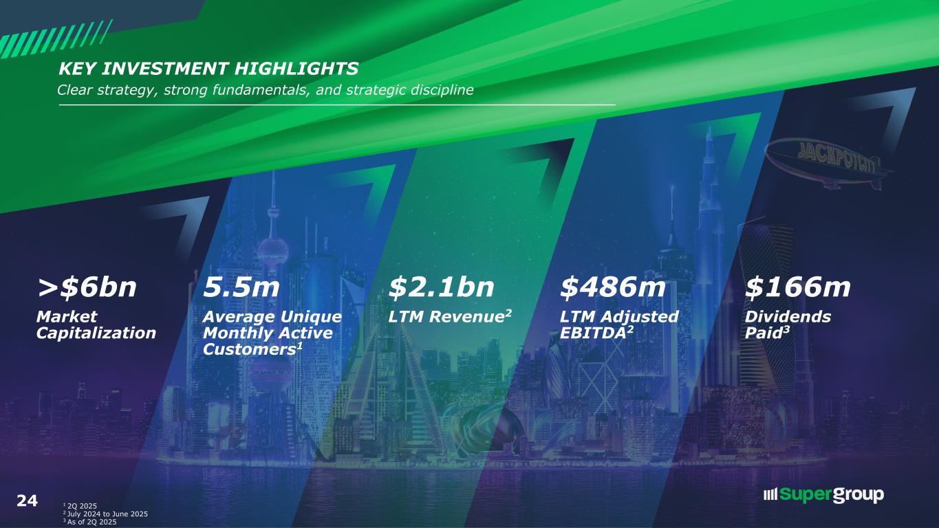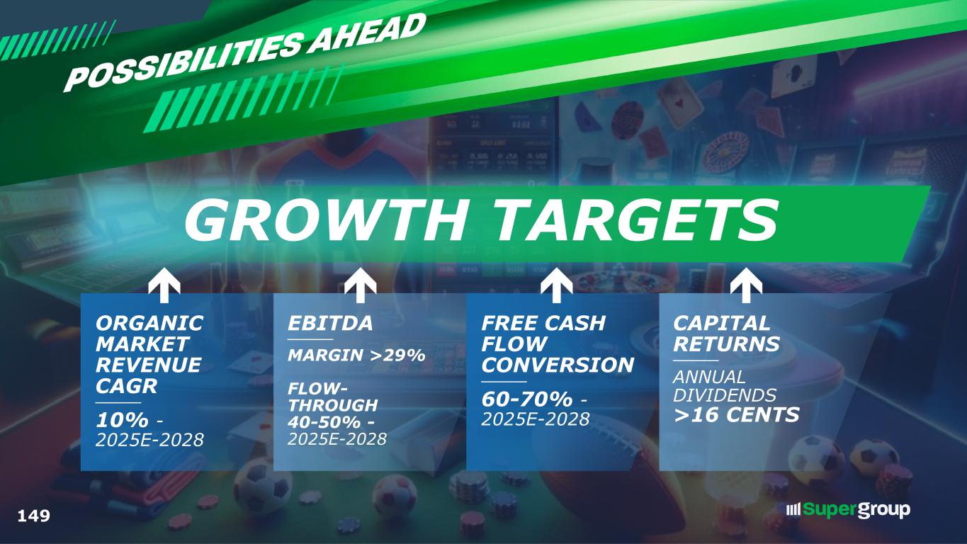 Forward-Looking Statements Certain statements made in this press release are “forward looking statements” within the meaning of the “safe harbor” provisions of the United States Private Securities Litigation Reform Act of 1995. These forward-looking statements include, but are not limited to, Super Group’s intention to pay a dividend, including the expected timing of such dividend, expectations and projections of market opportunity, growth and profitability.These forward-looking statements generally are identified by the words “believe,” “project,” “expect,” “anticipate,” “estimate,” “intend,” “strategy,” “future,” “opportunity,” “plan,” “pipeline,” “possible,” “may,” “should,” “will,” “would,” “will be,” “will continue,” “will likely result,” and similar expressions, but the absence of these words does not mean that a statement is not forward-looking. Forward-looking statements are predictions, projections and other statements about future events that are based on current expectations and assumptions and, as a result, are subject to risks and uncertainties. Many factors could cause actual future events to differ materially from the forward-looking statements in this press release, including but not limited to: (i) the ability to implement business plans, forecasts and other expectations, and identify and realize additional opportunities; (ii) changes in the competitive and regulated industries in which Super Group operates; (iii) variations in operating performance across competitors; (iv) changes in laws and regulations affecting Super Group’s business; (v) Super Group’s inability to meet or exceed its financial projections; (vi) changes in general economic conditions; (vii) changes in domestic and foreign business, market, financial, political and legal conditions, including abrupt or unexpected changes in interest rates or increases in inflation or inflationary expectations and reductions in discretionary consumer spending; (viii) the ability of Super Group’s customers to deposit funds in order to participate in Super Group’s gaming products; (ix) Super Group’s ability, and the ability of Super Group’s key executives, certain employees, significant shareholders or other applicable individuals, to comply with regulatory requirements or successfully obtain a license or permit required in a particular regulated jurisdiction, or maintain, renew or expand existing licenses; (x) the effectiveness of technological solutions Super Group has in place to block customers in certain jurisdictions, including jurisdictions where Super Group’s business is illegal, or which are sanctioned by countries in which Super Group operates from accessing its offerings; (xi) Super Group’s ability to restrict and manage betting limits at the individual customer level based on individual customer profiles and risk level to the enterprise; (xii) Super Group’s ability to protect or enforce its intellectual property rights, the confidentiality of its trade secrets and confidential information, or the costs involved in protecting or enforcing Super Group’s intellectual property rights and confidential information, and Super Group’s ability to obtain new licenses and maintain, renew or expand existing licenses to use the intellectual property of third parties; (xiii) compliance with applicable data protection and privacy laws in Super Group’s collection, storage and use, including sharing and international transfers, of personal data; (xiv) failures, errors, defects or disruptions in Super Group’s information technology and other systems and platforms; (xv) Super Group’s ability to develop new products, services, and solutions, bring them to market in a timely manner, and make enhancements to its platform; (xvi) Super Group’s ability to maintain and grow its market share, including its ability to enter new markets and acquire and retain paying customers; (xvii) the success, including win or hold rates, of existing and future online betting and gaming products; (xiii) competition within the broader entertainment industry; (xix) Super Group’s reliance on strategic relationships with land based casinos, sports teams, event planners, local licensing partners and advertisers; (xx) events or media coverage relating to, or the popularity of, online betting and gaming industry; (xxi) trading, liability management and pricing risk related to Super Group’s participation in the sports betting and gaming industry; (xxii) accessibility to the services of banks, credit card issuers and payment processing services providers due to the nature of Super Group’s business; (xxiii) the regulatory approvals related to proposed acquisitions and the integration of the acquired businesses; and (xxiv) other risks and uncertainties indicated from time to time for Super Group including those under the heading “Risk Factors” in our Annual Report on Form 20-F filed with the SEC on April 3, 2025, and in Super Group’s other filings with the SEC. The foregoing list of factors is not exhaustive. You should carefully consider the foregoing factors and the other risks and uncertainties described in other documents filed or that may be filed by Super Group from time to time with the SEC. These filings identify and address other important risks and uncertainties that could cause actual events and results to differ materially from those contained in the forward-looking statements. Forward-looking statements speak only as of the date they are made. Readers are cautioned not to put undue reliance on forward-looking statements, and Super Group assumes no obligation and does not intend to update or revise these forward-looking statements, whether as a result of new information, future events, or otherwise, except as required by law. Super Group does not give any assurance, representation or warranty that it will achieve its expectat