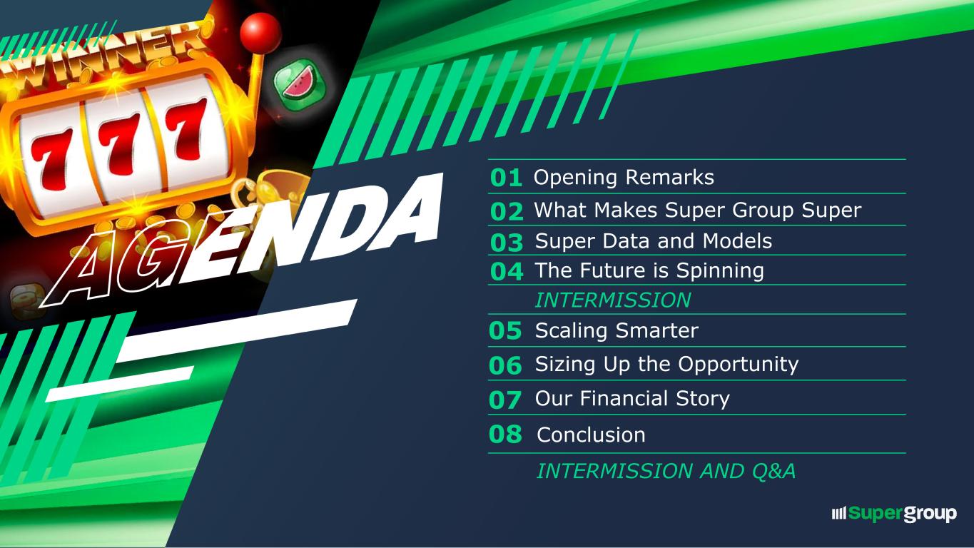 What Makes Super Group Super02 03 04 Scaling Smarter05 INTERMISSION Sizing Up the Opportunity06 Super Data and Models 07 Our Financial Story 08 Conclusion INTERMISSION AND Q&A The Future is Spinning Opening Remarks01