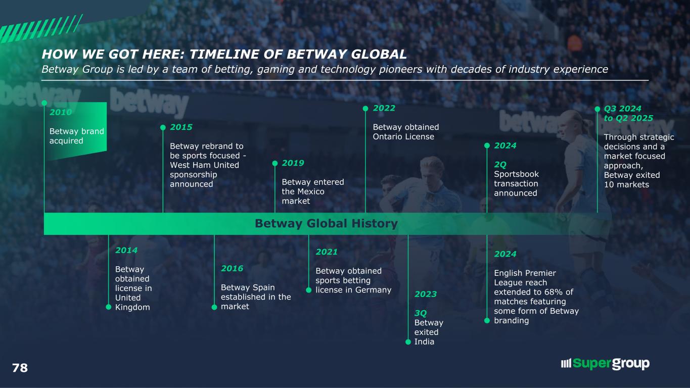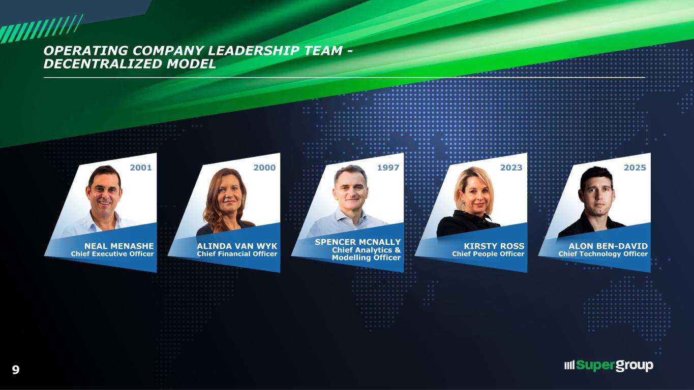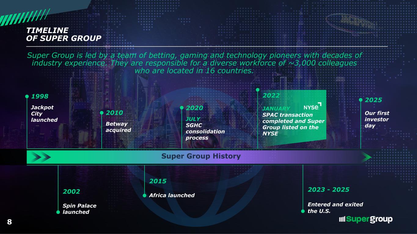 Super Group is led by a team of betting, gaming and technology pioneers with decades of industry experience. They are responsible for a diverse workforce of ~3,000 colleagues who are located in 16 countries. Super Group History 1998 Jackpot City launched 2010 Betway acquired 2022 JANUARY SPAC transaction completed and Super Group listed on the NYSE 2025 Our first investor day 2002 Spin Palace launched 2015 Africa launched 2023 - 2025 Entered and exited the U.S. 8 2020 JULY SGHC consolidation process TIMELINE OF SUPER GROUP