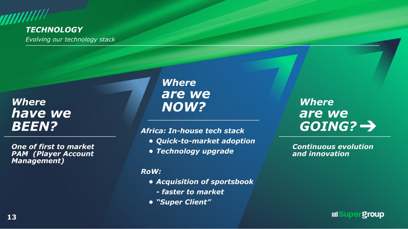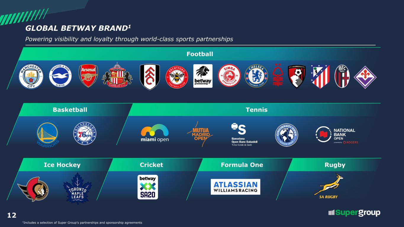 1Includes a selection of Super Group’s partnerships and sponsorship agreements GLOBAL BETWAY BRAND1 Football Basketball Ice Hockey Tennis Cricket Formula One Rugby 12 Powering visibility and loyalty through world-class sports partnerships