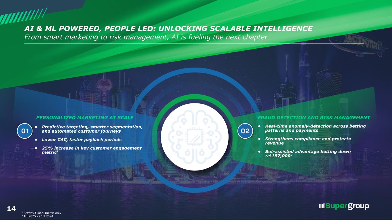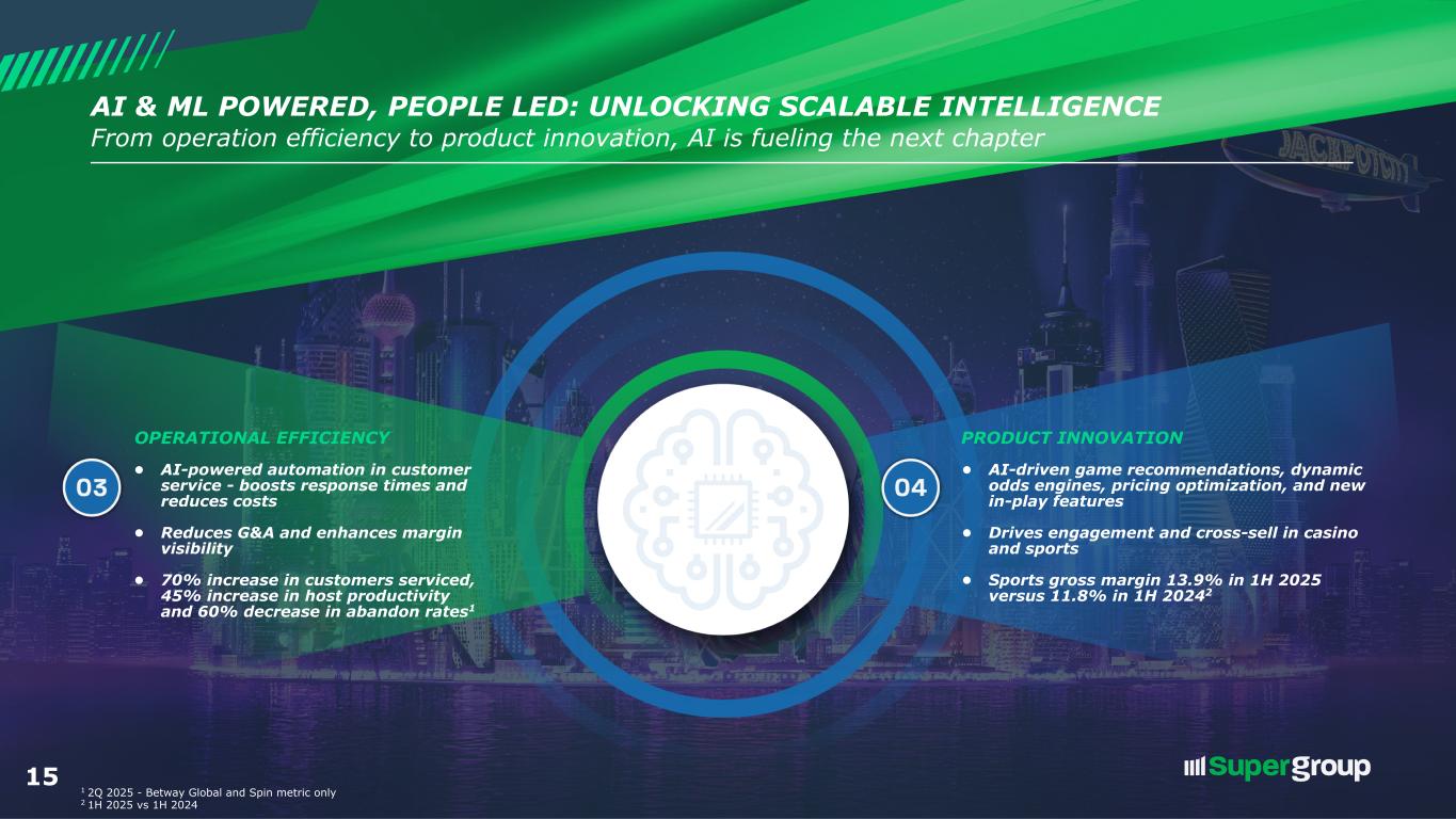 14 From smart marketing to risk management, AI is fueling the next chapter AI & ML POWERED, PEOPLE LED: UNLOCKING SCALABLE INTELLIGENCE PERSONALIZED MARKETING AT SCALE • Predictive targeting, smarter segmentation, and automated customer journeys • Lower CAC, faster payback periods • 25% increase in key customer engagement metric1 FRAUD DETECTION AND RISK MANAGEMENT • Real-time anomaly-detection across betting patterns and payments • Strengthens compliance and protects revenue • Bot-assisted advantage betting down ~$187,0002 1 Betway Global metric only 2 1H 2025 vs 1H 2024