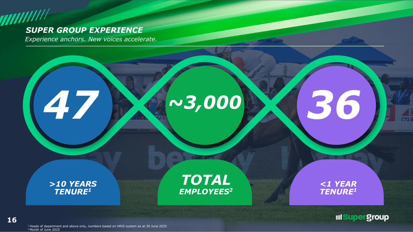 15 From operation efficiency to product innovation, AI is fueling the next chapter AI & ML POWERED, PEOPLE LED: UNLOCKING SCALABLE INTELLIGENCE OPERATIONAL EFFICIENCY • AI-powered automation in customer service - boosts response times and reduces costs • Reduces G&A and enhances margin visibility • 70% increase in customers serviced, 45% increase in host productivity and 60% decrease in abandon rates1 PRODUCT INNOVATION • AI-driven game recommendations, dynamic odds engines, pricing optimization, and new in-play features • Drives engagement and cross-sell in casino and sports • Sports gross margin 13.9% in 1H 2025 versus 11.8% in 1H 20242 1 2Q 2025 - Betway Global and Spin metric only 2 1H 2025 vs 1H 2024
