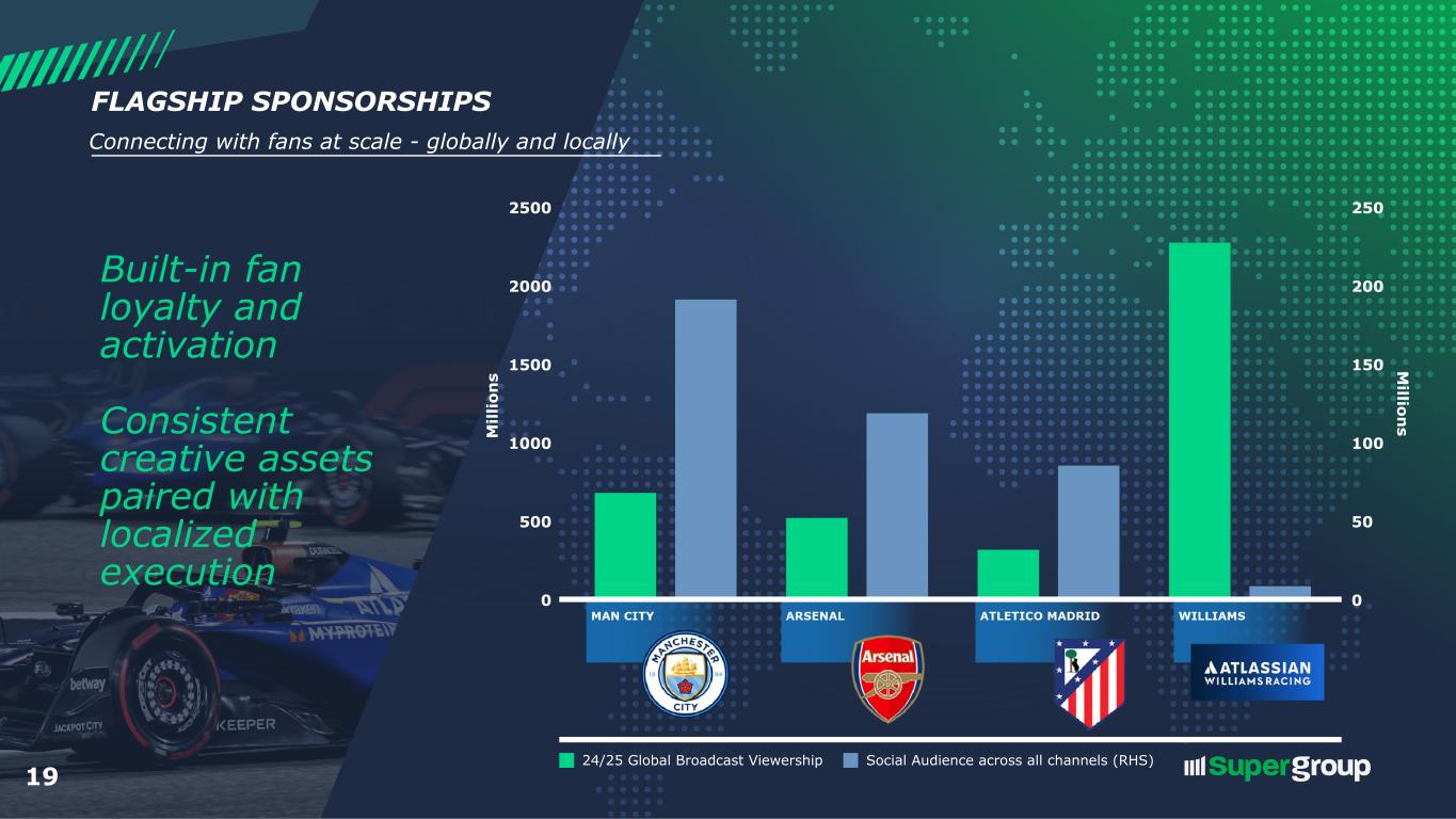 18 FLAGSHIP SPONSORSHIPS Significant visibility through global sponsorships Brand reach without redundancy Elevated brand equity = lower CPA GLOBAL SPONSORSHIP SPLIT La Liga F1 Tennis Serie A Cricket Basketball EPL Rugby PSL Ambassadors Strategic sponsorships unlocking scaled exposure and efficient growth