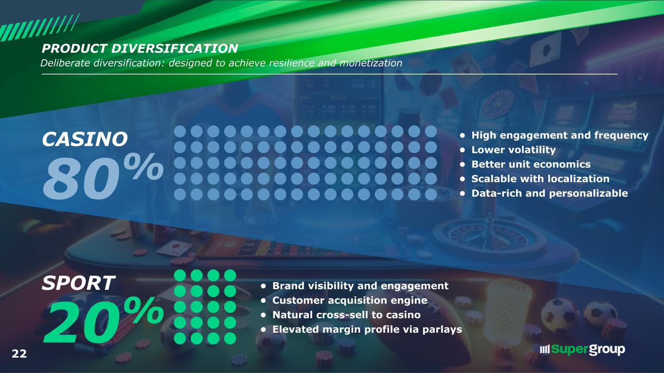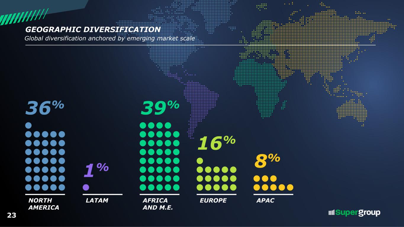22 PRODUCT DIVERSIFICATION CASINO 80% SPORT 20% • High engagement and frequency • Lower volatility • Better unit economics • Scalable with localization • Data-rich and personalizable • Brand visibility and engagement • Customer acquisition engine • Natural cross-sell to casino • Elevated margin profile via parlays Deliberate diversification: designed to achieve resilience and monetization