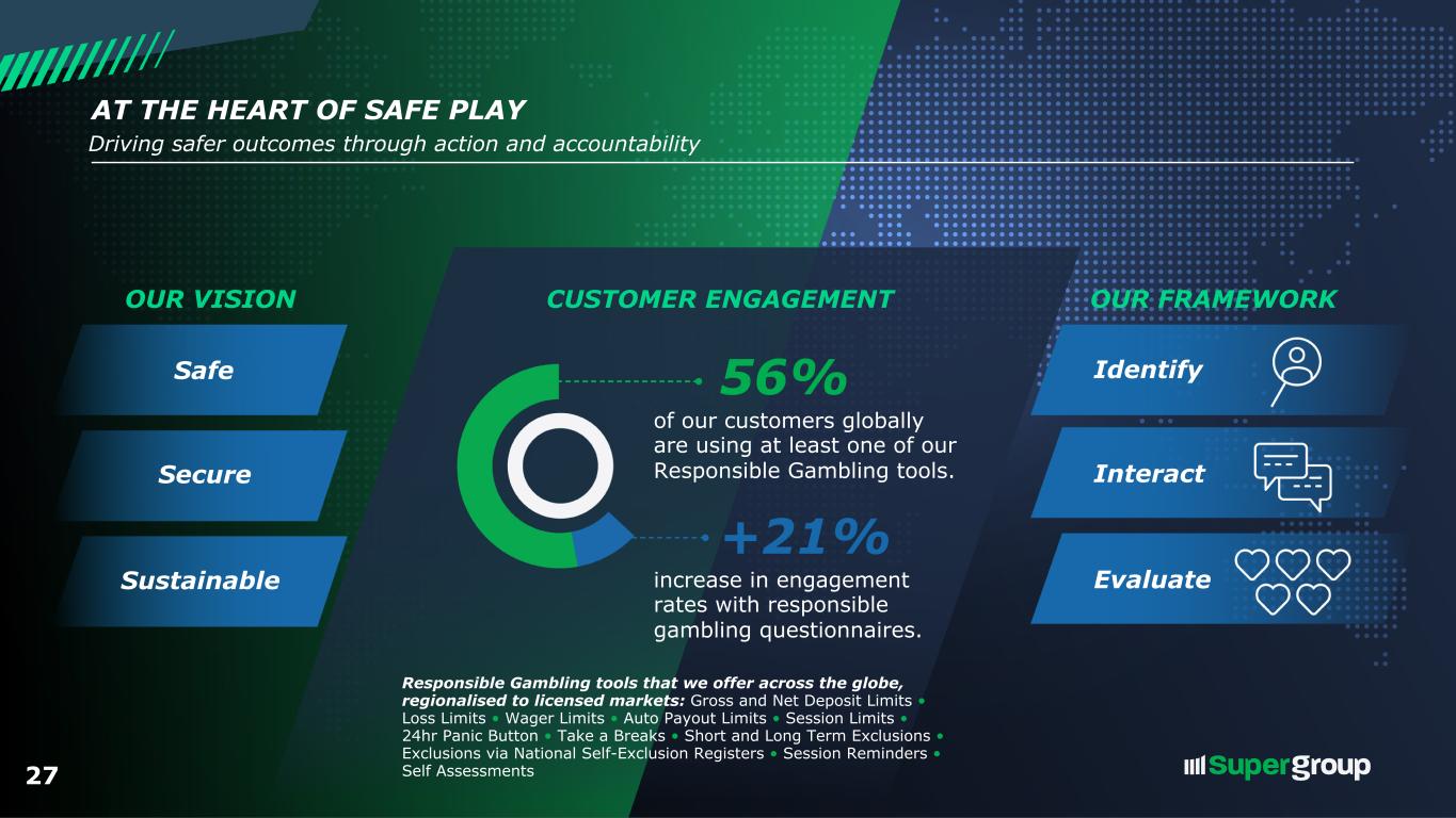 Driving safer outcomes through action and accountability 27 AT THE HEART OF SAFE PLAY OUR VISION CUSTOMER ENGAGEMENT Safe Secure Sustainable OUR FRAMEWORK Identify Interact Evaluate 56% +21% of our customers globally are using at least one of our Responsible Gambling tools. increase in engagement rates with responsible gambling questionnaires. Responsible Gambling tools that we offer across the globe, regionalised to licensed markets: Gross and Net Deposit Limits • Loss Limits • Wager Limits • Auto Payout Limits • Session Limits • 24hr Panic Button • Take a Breaks • Short and Long Term Exclusions • Exclusions via National Self-Exclusion Registers • Session Reminders • Self Assessments