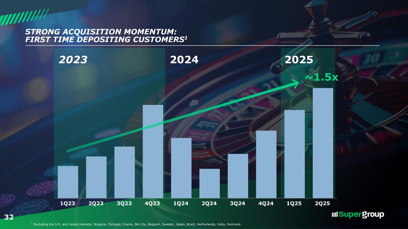 STRONG ACQUISITION MOMENTUM: FIRST TIME DEPOSITING CUSTOMERS1 1Q23 2Q23 3Q23 4Q23 1Q24 2Q24 3Q24 4Q24 1Q25 2Q25 2023 2024 2025 ~1.5x 32 1 Excluding the U.S. and closed markets: Bulgaria, Portugal, France, BA City, Belgium, Sweden, Japan, Brazil, Netherlands, India, Denmark