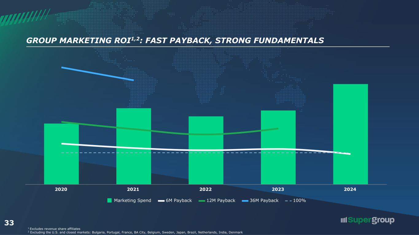 1 Excludes revenue share affiliates 2 Excluding the U.S. and closed markets: Bulgaria, Portugal, France, BA City, Belgium, Sweden, Japan, Brazil, Netherlands, India, Denmark Marketing Spend 6M Payback 12M Payback 36M Payback 100% 2020 2021 2022 2023 2024 GROUP MARKETING ROI1,2: FAST PAYBACK, STRONG FUNDAMENTALS 33