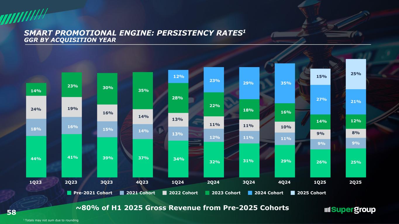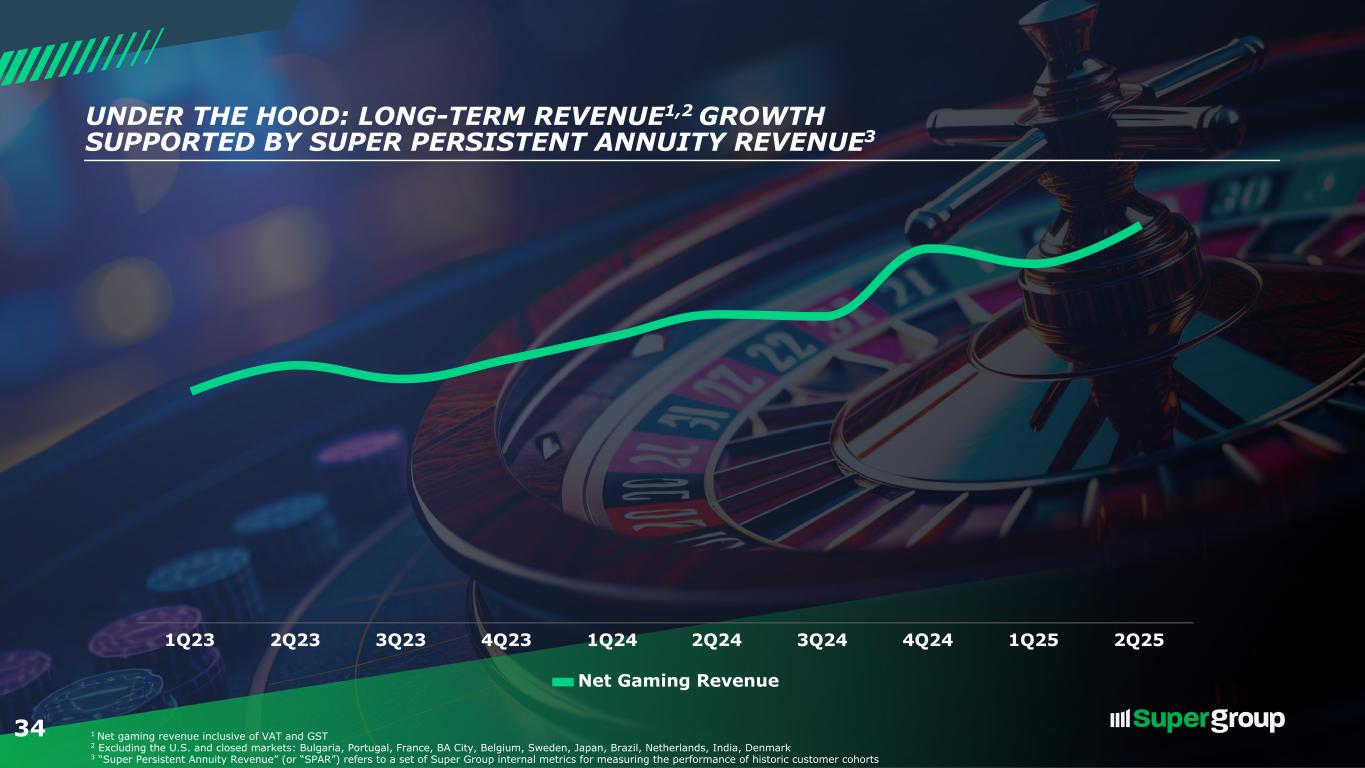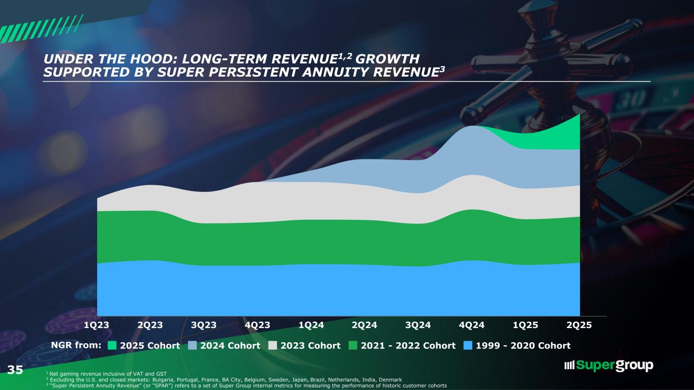 1 Net gaming revenue inclusive of VAT and GST 2 Excluding the U.S. and closed markets: Bulgaria, Portugal, France, BA City, Belgium, Sweden, Japan, Brazil, Netherlands, India, Denmark 3 “Super Persistent Annuity Revenue” (or “SPAR”) refers to a set of Super Group internal metrics for measuring the performance of historic customer cohorts Net Gaming Revenue 1Q23 2Q23 3Q23 4Q23 1Q24 2Q24 3Q24 4Q24 1Q25 2Q25 34 UNDER THE HOOD: LONG-TERM REVENUE1,2 GROWTH SUPPORTED BY SUPER PERSISTENT ANNUITY REVENUE3