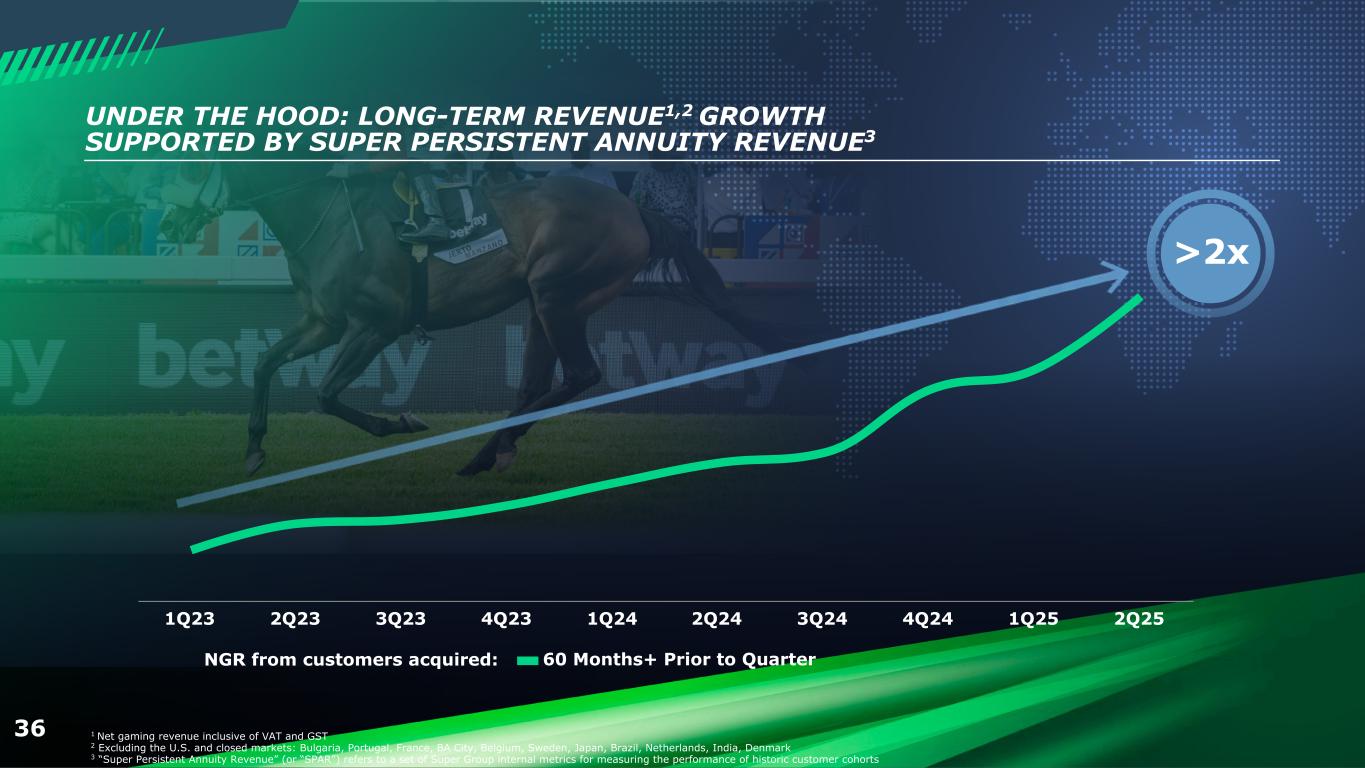 2025 Cohort 2024 Cohort 2023 Cohort 2021 - 2022 Cohort 1999 - 2020 Cohort 1Q23 2Q23 3Q23 4Q23 1Q24 2Q24 3Q24 4Q24 1Q25 2Q25 35 UNDER THE HOOD: LONG-TERM REVENUE1,2 GROWTH SUPPORTED BY SUPER PERSISTENT ANNUITY REVENUE3 NGR from: 1 Net gaming revenue inclusive of VAT and GST 2 Excluding the U.S. and closed markets: Bulgaria, Portugal, France, BA City, Belgium, Sweden, Japan, Brazil, Netherlands, India, Denmark 3 “Super Persistent Annuity Revenue” (or “SPAR”) refers to a set of Super Group internal metrics for measuring the performance of historic customer cohorts