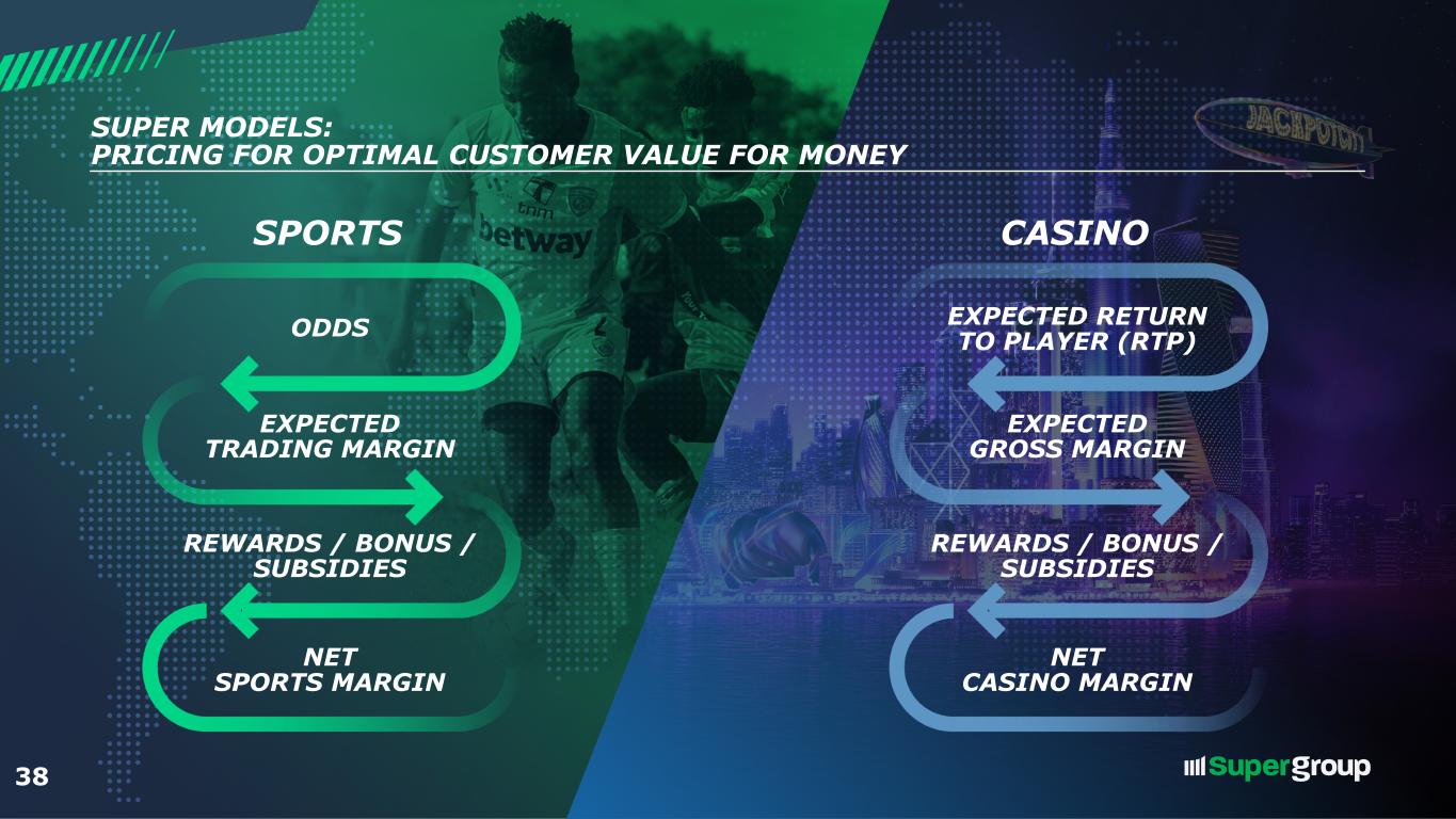 38 SUPER MODELS: PRICING FOR OPTIMAL CUSTOMER VALUE FOR MONEY SPORTS CASINO EXPECTED TRADING MARGIN ODDS REWARDS / BONUS / SUBSIDIES NET SPORTS MARGIN EXPECTED GROSS MARGIN EXPECTED RETURN TO PLAYER (RTP) REWARDS / BONUS / SUBSIDIES NET CASINO MARGIN