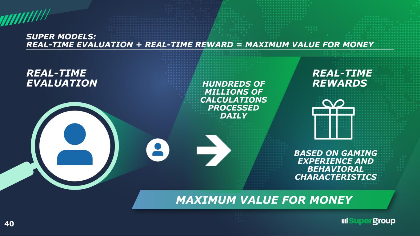 SUPER MODELS: REAL-TIME EVALUATION + REAL-TIME REWARD = MAXIMUM VALUE FOR MONEY 40 REAL-TIME EVALUATION HUNDREDS OF MILLIONS OF CALCULATIONS PROCESSED DAILY REAL-TIME REWARDS BASED ON GAMING EXPERIENCE AND BEHAVIORAL CHARACTERISTICS MAXIMUM VALUE FOR MONEY