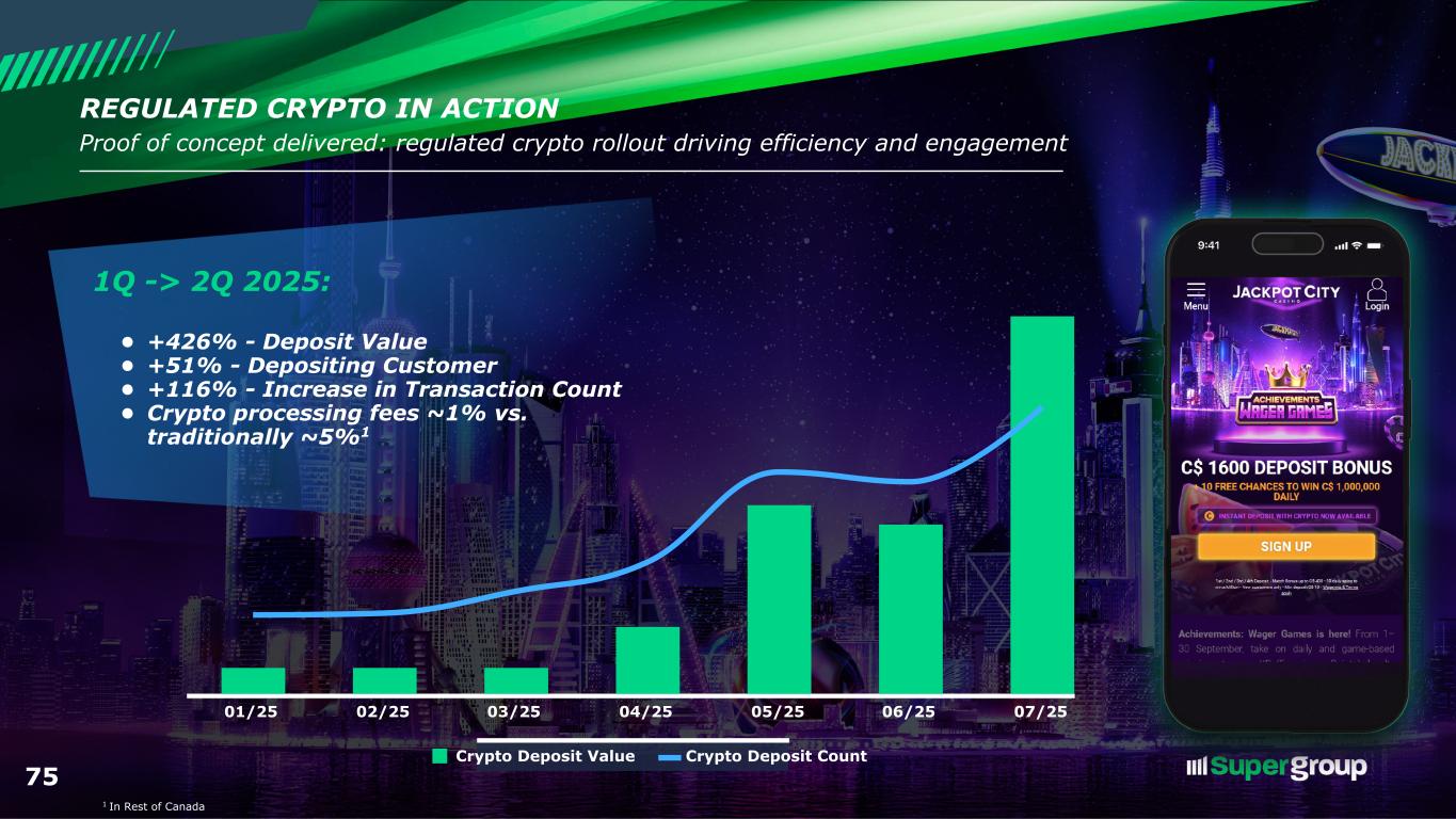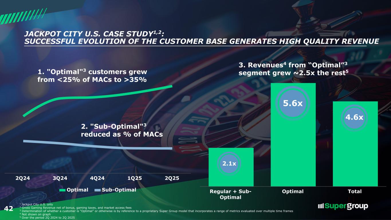 Optimal Sub-Optimal 2Q24 3Q24 4Q24 1Q25 2Q25 2. "Sub-Optimal"3 reduced as % of MACs Regular + Sub- Optimal Optimal Total 2.1x 4.6x 42 5.6x 3. Revenues4 from “Optimal”3 segment grew ~2.5x the rest51. "Optimal"3 customers grew from <25% of MACs to >35% JACKPOT CITY U.S. CASE STUDY1,2: SUCCESSFUL EVOLUTION OF THE CUSTOMER BASE GENERATES HIGH QUALITY REVENUE 1 Jackpot City U.S. only 2 Gross Gaming Revenue net of bonus, gaming taxes, and market access fees 3 Determination of whether a customer is “Optimal” or otherwise is by reference to a proprietary Super Group model that incorporates a range of metrics evaluated over multiple time frames 4 Not shown on graph 5 Over the period 2Q 2024 to 2Q 2025