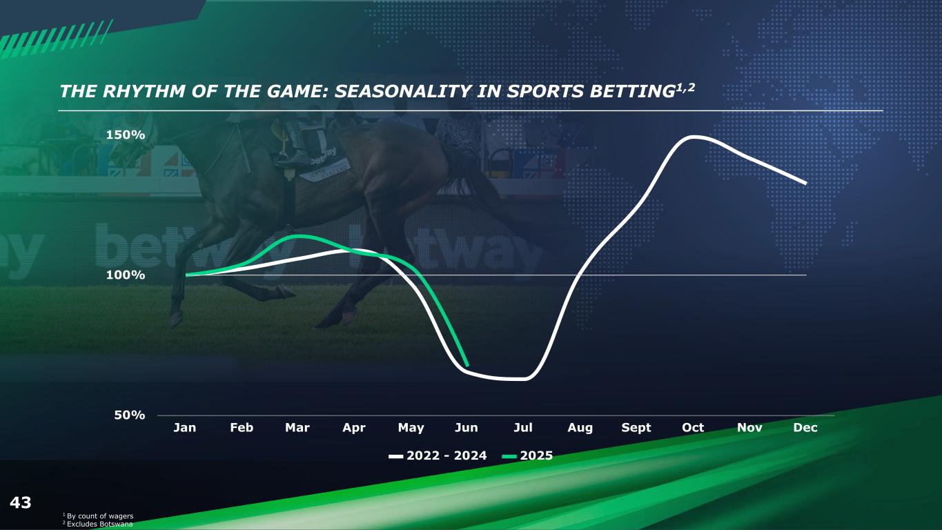 43 THE RHYTHM OF THE GAME: SEASONALITY IN SPORTS BETTING1,2 1 By count of wagers 2 Excludes Botswana 2022 - 2024 2025 Jan Feb Mar Apr May Jun Jul Aug Sept Oct Nov Dec 50% 100% 150%