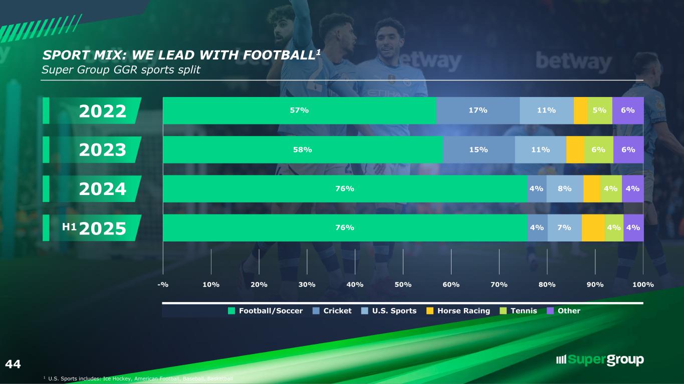 44 1 U.S. Sports includes: Ice Hockey, American Football, Baseball, Basketball SPORT MIX: WE LEAD WITH FOOTBALL1 2022 2023 2024 2025H1 Super Group GGR sports split 57% 58% 76% 76% 17% 15% 4% 4% 11% 11% 8% 7% 5% 6% 4% 4% 6% 6% 4% 4% Football/Soccer Cricket U.S. Sports Horse Racing Tennis Other