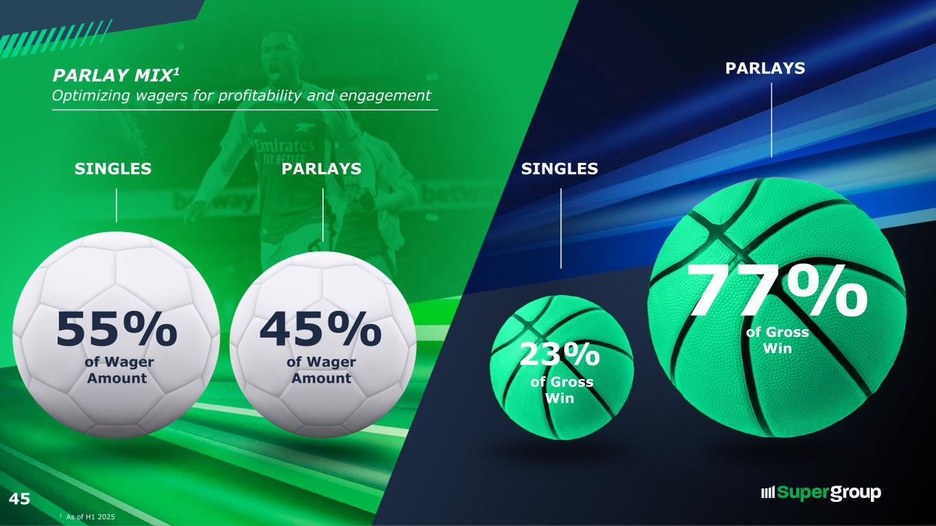 45 of Wager Amount 45%55% of Wager Amount PARLAYSSINGLES of Gross Win 77% 23% of Gross Win 1 As of H1 2025 PARLAY MIX1 Optimizing wagers for profitability and engagement SINGLES PARLAYS