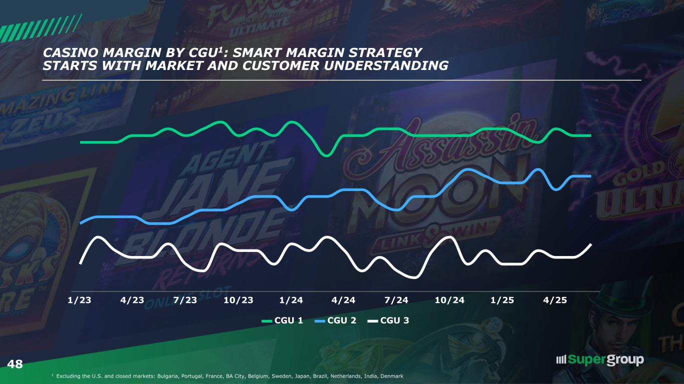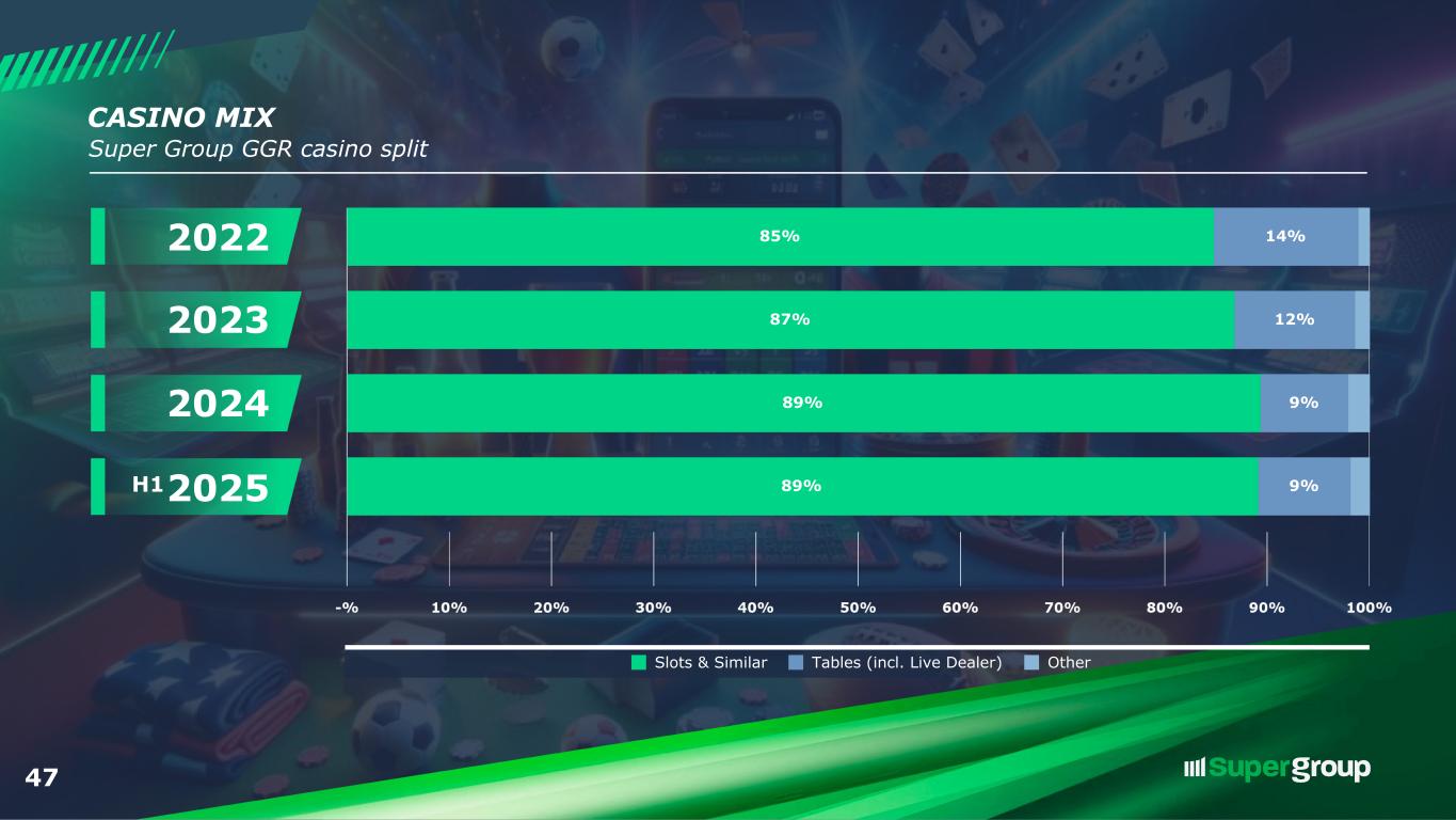 47 CASINO MIX 2022 2023 2024 2025H1 Super Group GGR casino split 85% 87% 89% 89% 14% 12% 9% 9% Slots & Similar Tables (incl. Live Dealer) Other