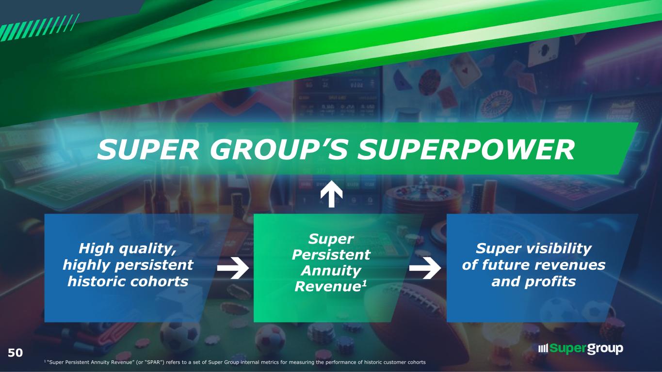 50 SUPER GROUP’S SUPERPOWER Super Persistent Annuity Revenue1 High quality, highly persistent historic cohorts Super visibility of future revenues and profits 1 “Super Persistent Annuity Revenue” (or “SPAR”) refers to a set of Super Group internal metrics for measuring the performance of historic customer cohorts