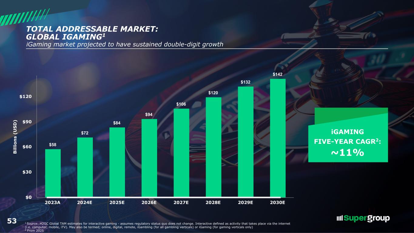 iGaming market projected to have sustained double-digit growth 53 1 Source: H2GC Global TAM estimates for interactive gaming - assumes regulatory status quo does not change. Interactive defined as activity that takes place via the internet (i.e. computer, mobile, iTV). May also be termed; online, digital, remote, iGambling (for all gambling verticals) or iGaming (for gaming verticals only) 2 From 2025 TOTAL ADDRESSABLE MARKET: GLOBAL IGAMING1 B ill io n s (U S D ) $58 $72 $84 $94 $106 $120 $132 $142 2023A 2024E 2025E 2026E 2027E 2028E 2029E 2030E $0 $30 $60 $90 $120 iGAMING FIVE-YEAR CAGR2: ~11%