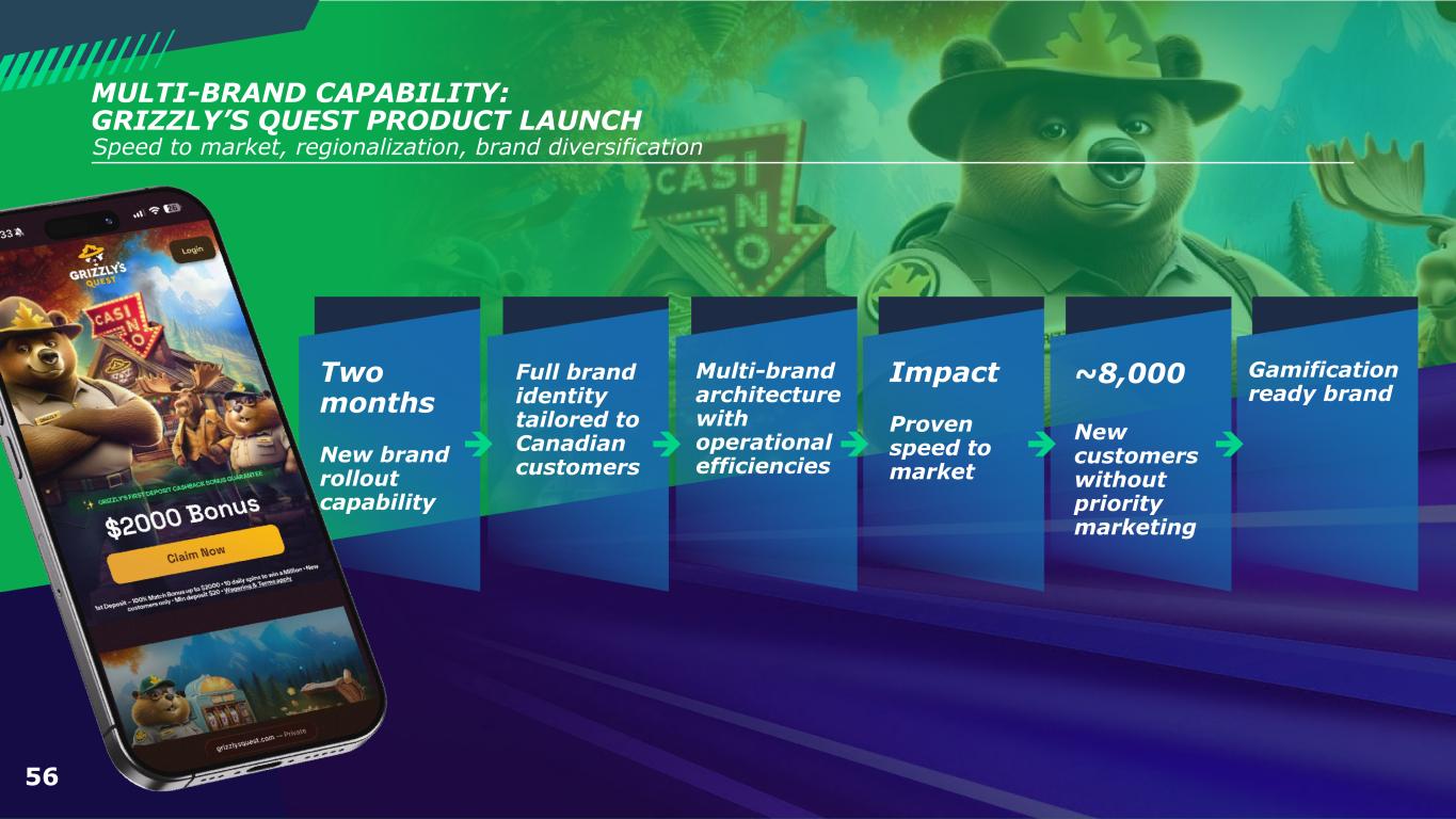 56 Speed to market, regionalization, brand diversification MULTI-BRAND CAPABILITY: GRIZZLY’S QUEST PRODUCT LAUNCH Full brand identity tailored to Canadian customers Multi-brand architecture with operational efficiencies Impact Proven speed to market Two months New brand rollout capability ~8,000 New customers without priority marketing Gamification ready brand