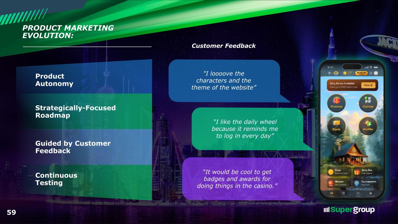 59 PRODUCT MARKETING EVOLUTION: Product Autonomy "I loooove the characters and the theme of the website” “I like the daily wheel because it reminds me to log in every day” “It would be cool to get badges and awards for doing things in the casino.” Customer Feedback Strategically-Focused Roadmap Guided by Customer Feedback Continuous Testing
