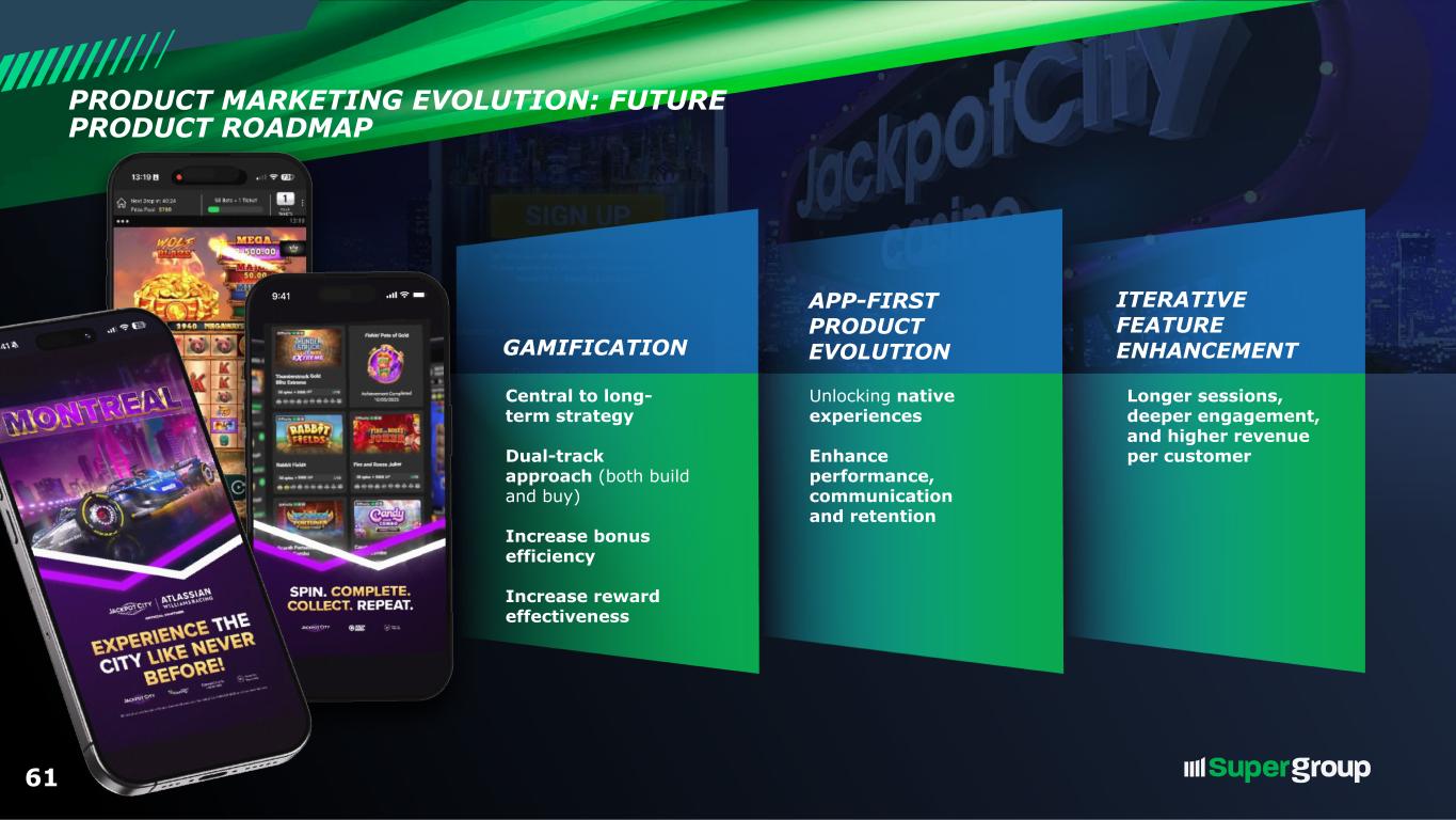 Longer sessions, deeper engagement, and higher revenue per customer GAMIFICATION APP-FIRST PRODUCT EVOLUTION Central to long- term strategy Dual-track approach (both build and buy) Increase bonus efficiency Increase reward effectiveness Unlocking native experiences Enhance performance, communication and retention ITERATIVE FEATURE ENHANCEMENT 61 PRODUCT MARKETING EVOLUTION: FUTURE PRODUCT ROADMAP