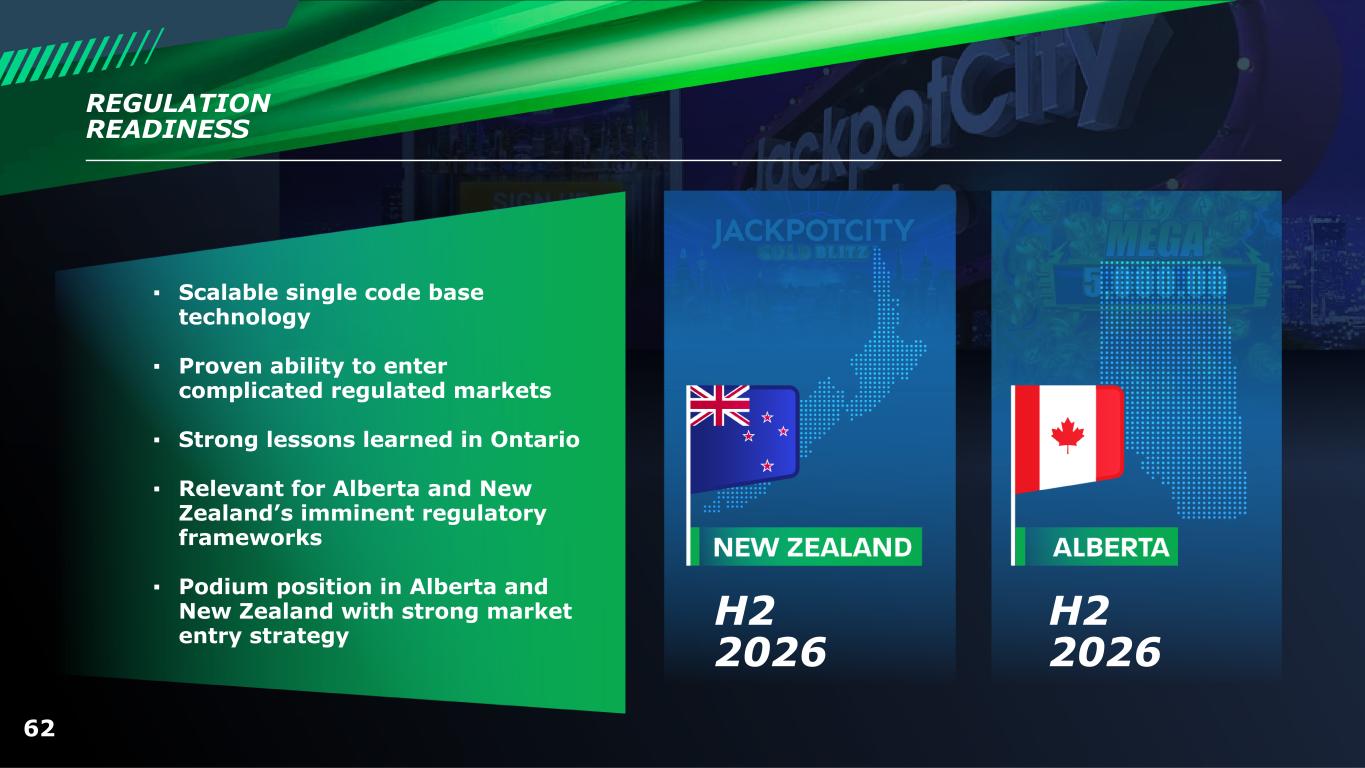 REGULATION READINESS ▪ Scalable single code base technology ▪ Proven ability to enter complicated regulated markets ▪ Strong lessons learned in Ontario ▪ Relevant for Alberta and New Zealand’s imminent regulatory frameworks ▪ Podium position in Alberta and New Zealand with strong market entry strategy H2 2026 H2 2026 62