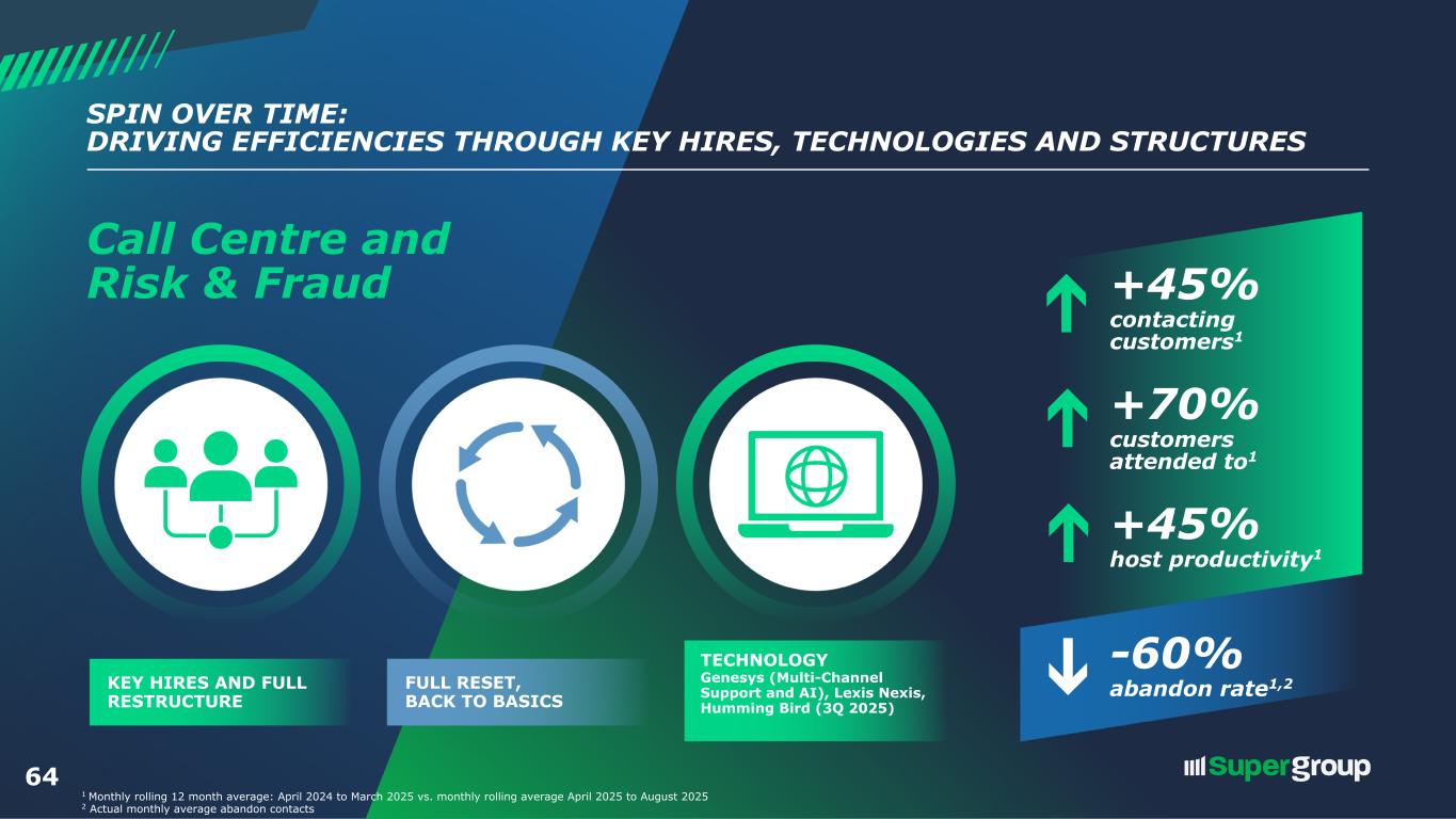 SPIN OVER TIME: DRIVING EFFICIENCIES THROUGH KEY HIRES, TECHNOLOGIES AND STRUCTURES 64 Call Centre and Risk & Fraud +45% contacting customers1 +70% customers attended to1 +45% host productivity1 -60% abandon rate1,2KEY HIRES AND FULL RESTRUCTURE FULL RESET, BACK TO BASICS TECHNOLOGY Genesys (Multi-Channel Support and AI), Lexis Nexis, Humming Bird (3Q 2025) 1 Monthly rolling 12 month average: April 2024 to March 2025 vs. monthly rolling average April 2025 to August 2025 2 Actual monthly average abandon contacts