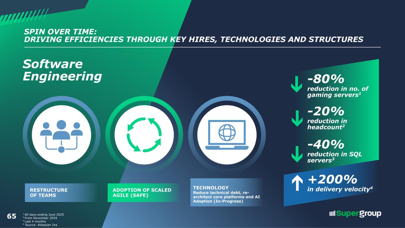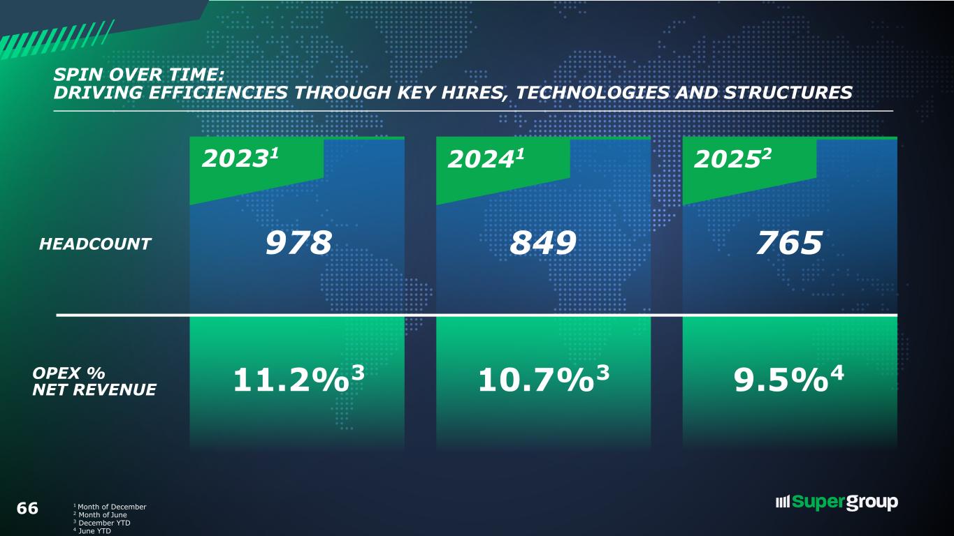 SPIN OVER TIME: DRIVING EFFICIENCIES THROUGH KEY HIRES, TECHNOLOGIES AND STRUCTURES 65 Software Engineering -80% reduction in no. of gaming servers1 RESTRUCTURE OF TEAMS ADOPTION OF SCALED AGILE (SAFE) TECHNOLOGY Reduce technical debt, re- architect core platforms and AI Adoption (In-Progress) -20% reduction in headcount2 -40% reduction in SQL servers3 +200% in delivery velocity4 1 60 days ending June 2025 2 From November 2024 3 Last 4 months 4 Source: Atlassian Jira