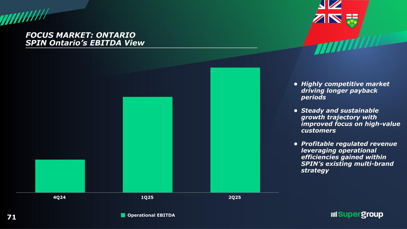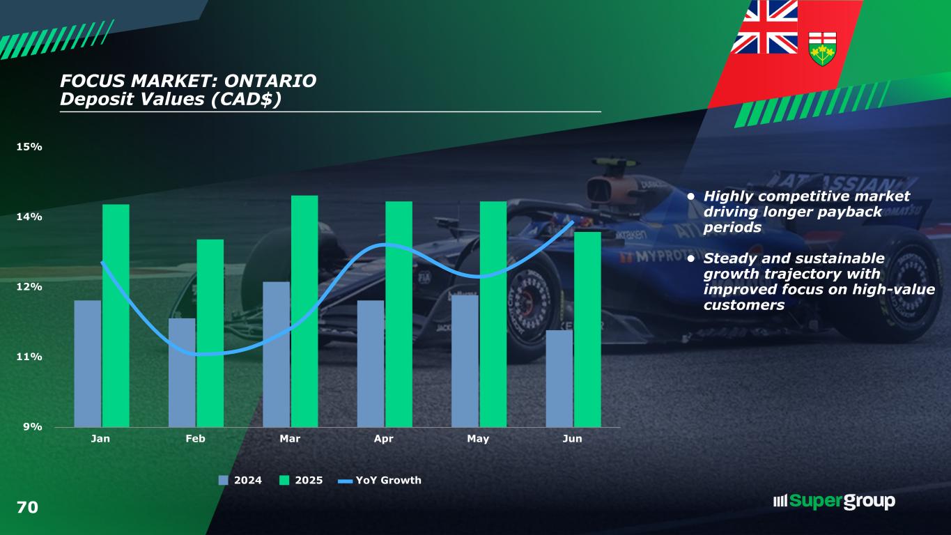 69 FOCUS MARKET: ONTARIO1,2 Marketing Spend 3M Payback (LHS) 1Q24 2Q24 3Q24 4Q24 1Q25 —% 5% 10% 15% 20% 25% 30% 35% 40% We are committed to the long-haul • Highly competitive market driving longer payback periods 1 Marketing excluding affiliate spend 2 3 month payback defined as gross contribution as a percentage of marketing spend, generated by the respective accounts acquired