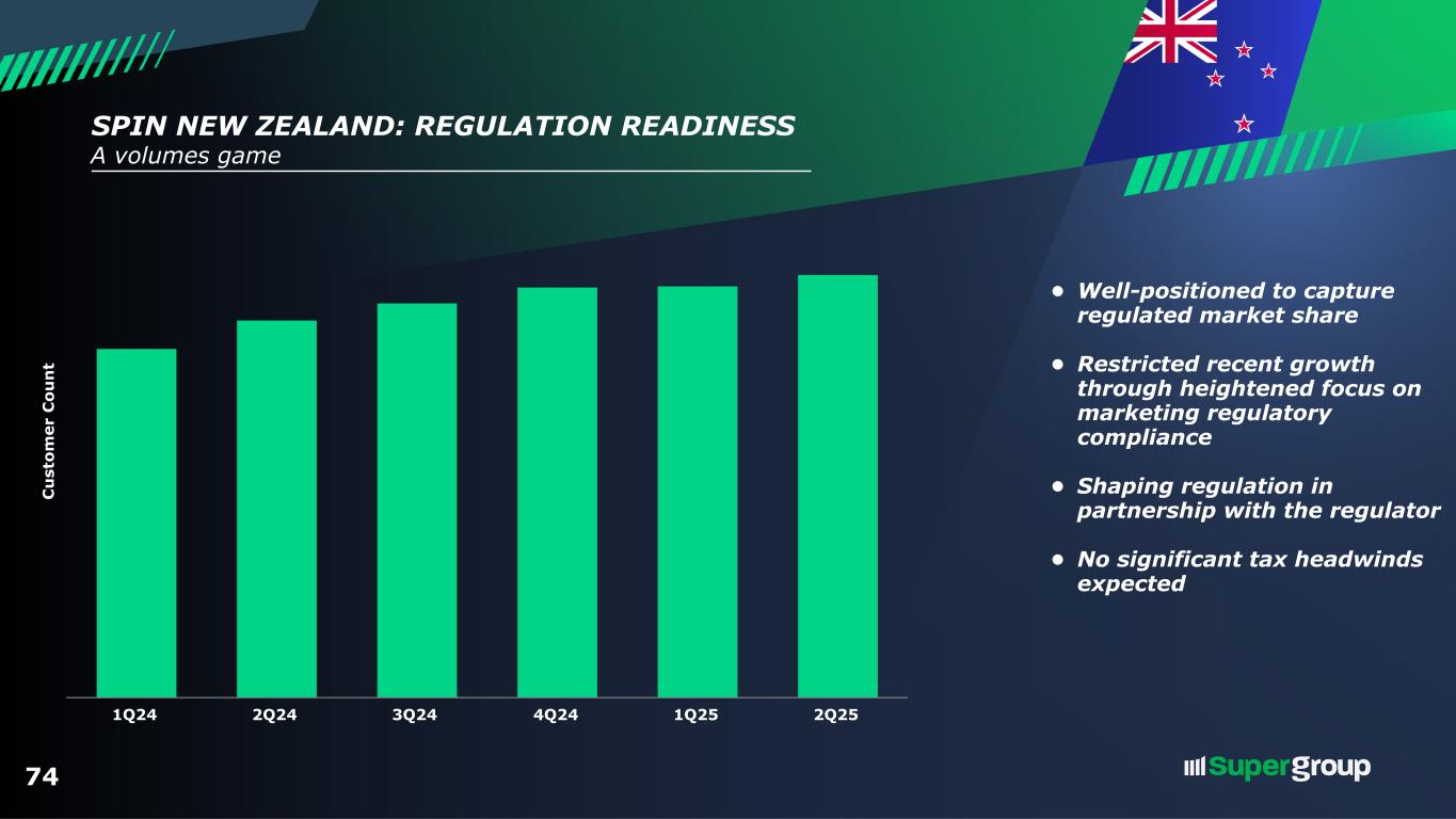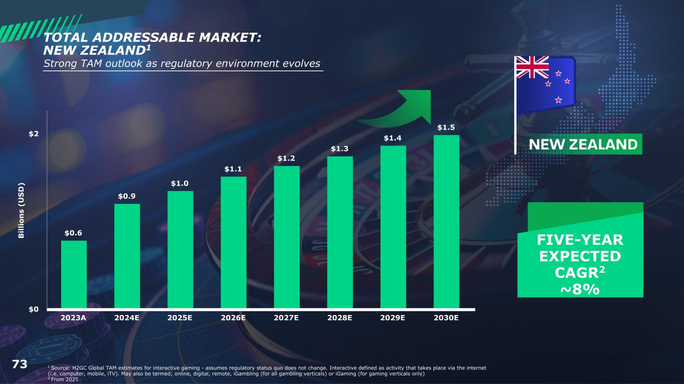 Strong TAM outlook as regulatory environment evolves 73 1 Source: H2GC Global TAM estimates for interactive gaming - assumes regulatory status quo does not change. Interactive defined as activity that takes place via the internet (i.e. computer, mobile, iTV). May also be termed; online, digital, remote, iGambling (for all gambling verticals) or iGaming (for gaming verticals only) 2 From 2025 TOTAL ADDRESSABLE MARKET: NEW ZEALAND1 B ill io n s (U S D ) $0.6 $0.9 $1.0 $1.1 $1.2 $1.3 $1.4 $1.5 2023A 2024E 2025E 2026E 2027E 2028E 2029E 2030E $0 $2 FIVE-YEAR EXPECTED CAGR2 ~8%