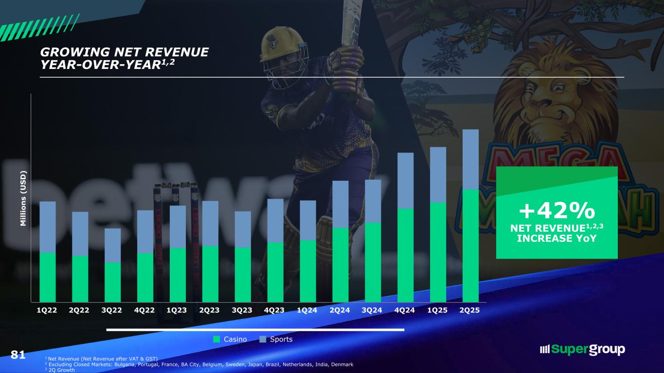 81 +42% NET REVENUE1,2,3 INCREASE YoY 1 Net Revenue (Net Revenue after VAT & GST) 2 Excluding Closed Markets: Bulgaria, Portugal, France, BA City, Belgium, Sweden, Japan, Brazil, Netherlands, India, Denmark 3 2Q Growth GROWING NET REVENUE YEAR-OVER-YEAR1,2 M ill io n s (U S D ) Casino Sports 1Q22 2Q22 3Q22 4Q22 1Q23 2Q23 3Q23 4Q23 1Q24 2Q24 3Q24 4Q24 1Q25 2Q25