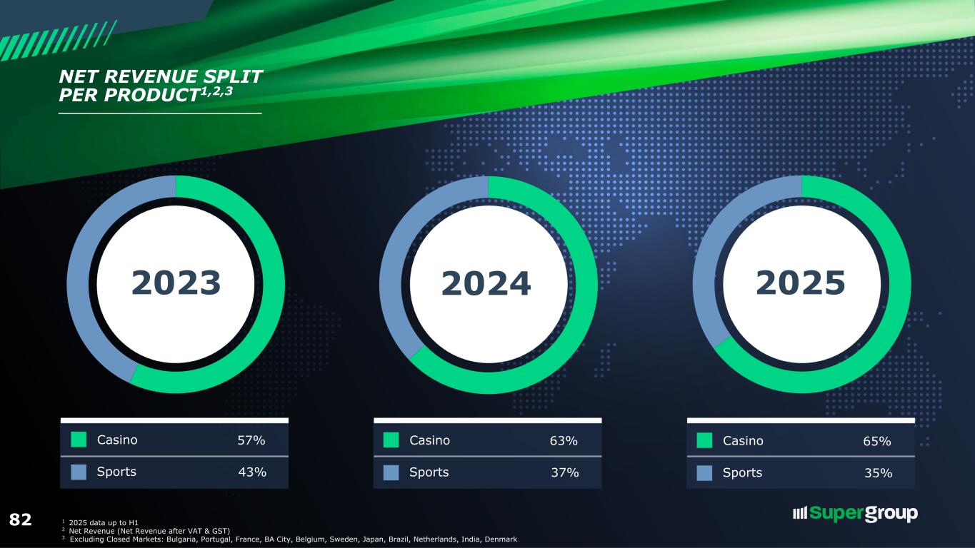 82 1 2025 data up to H1 2 Net Revenue (Net Revenue after VAT & GST) 3 Excluding Closed Markets: Bulgaria, Portugal, France, BA City, Belgium, Sweden, Japan, Brazil, Netherlands, India, Denmark NET REVENUE SPLIT PER PRODUCT1,2,3 2023 2024 2025 Casino 57% Sports 43% Casino 63% Sports 37% Casino 65% Sports 35%