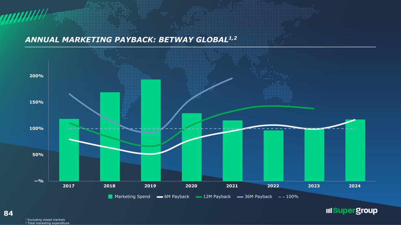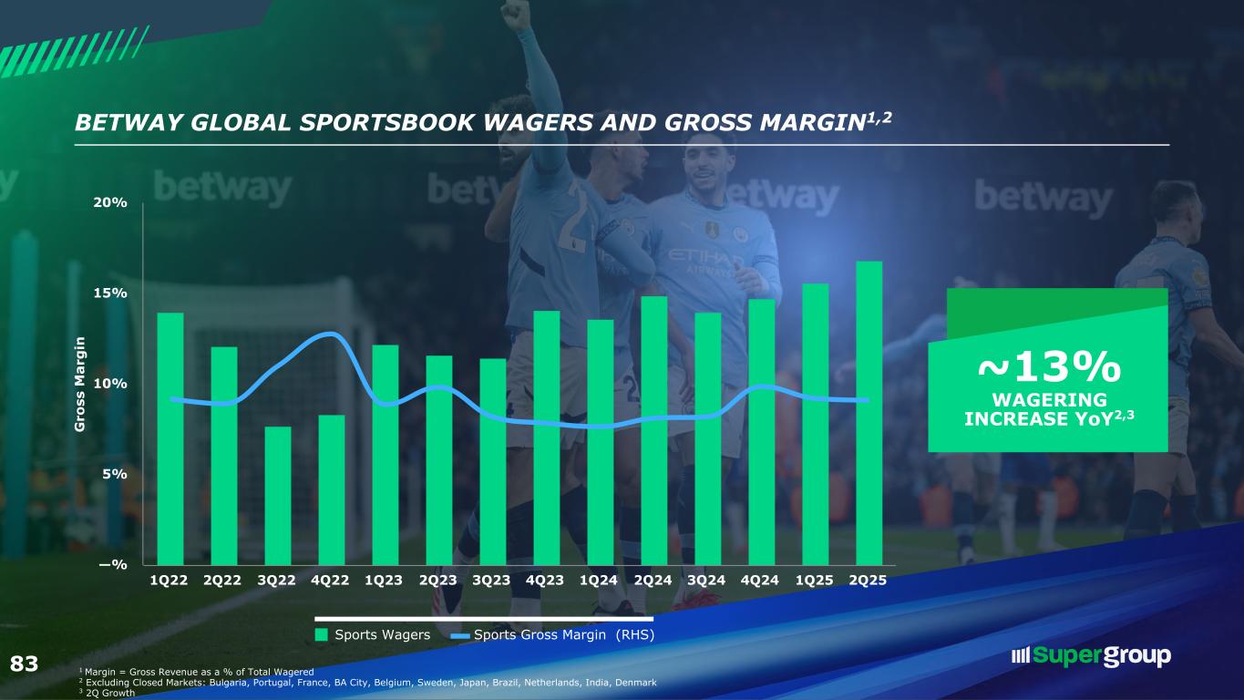 83 G ro ss M ar g in Sports Wagers Sports Gross Margin (RHS) 1Q22 2Q22 3Q22 4Q22 1Q23 2Q23 3Q23 4Q23 1Q24 2Q24 3Q24 4Q24 1Q25 2Q25 —% 5% 10% 15% 20% ~13% WAGERING INCREASE YoY2,3 1 Margin = Gross Revenue as a % of Total Wagered 2 Excluding Closed Markets: Bulgaria, Portugal, France, BA City, Belgium, Sweden, Japan, Brazil, Netherlands, India, Denmark 3 2Q Growth BETWAY GLOBAL SPORTSBOOK WAGERS AND GROSS MARGIN1,2