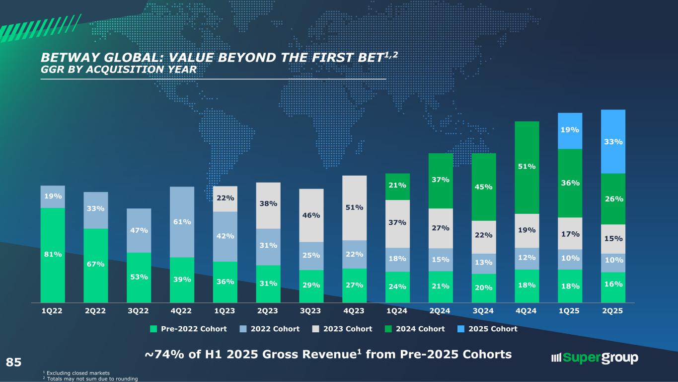 BETWAY GLOBAL: VALUE BEYOND THE FIRST BET1,2 GGR BY ACQUISITION YEAR 85 Pre-2022 Cohort 2022 Cohort 2023 Cohort 2024 Cohort 2025 Cohort 1Q22 2Q22 3Q22 4Q22 1Q23 2Q23 3Q23 4Q23 1Q24 2Q24 3Q24 4Q24 1Q25 2Q25 1 Excluding closed markets 2 Totals may not sum due to rounding 16% 10% 15% 26% 33% 18% 10% 17% 36% 19% ~74% of H1 2025 Gross Revenue1 from Pre-2025 Cohorts 18% 12% 19% 51% 20% 13% 22% 45% 21% 15% 27% 37% 24% 18% 37% 21% 27% 22% 51% 29% 25% 46% 31% 31% 38% 36% 42% 22% 61% 39% 47% 53% 33% 67% 19% 81%