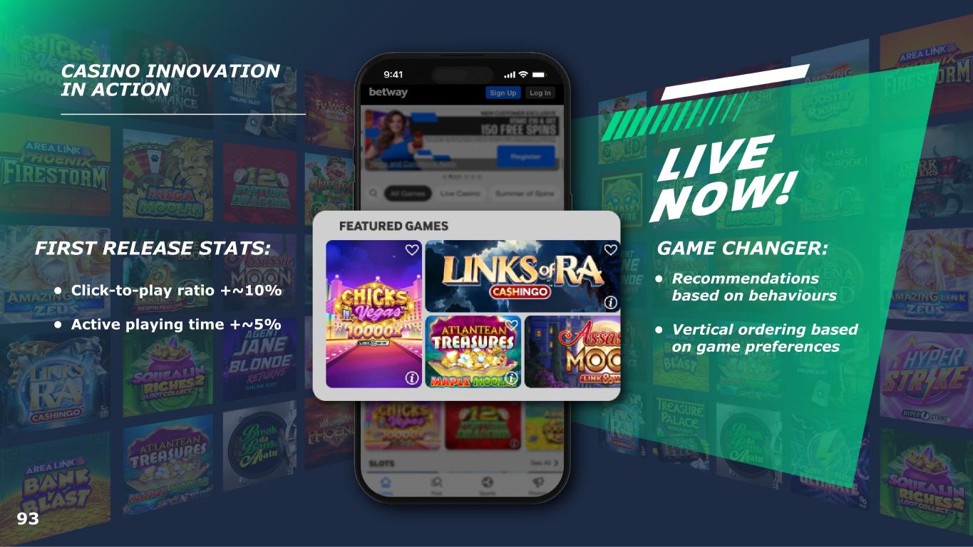 CASINO INNOVATION IN ACTION 93 GAME CHANGER: • Recommendations based on behaviours • Vertical ordering based on game preferences FIRST RELEASE STATS: • Click-to-play ratio +~10% • Active playing time +~5%