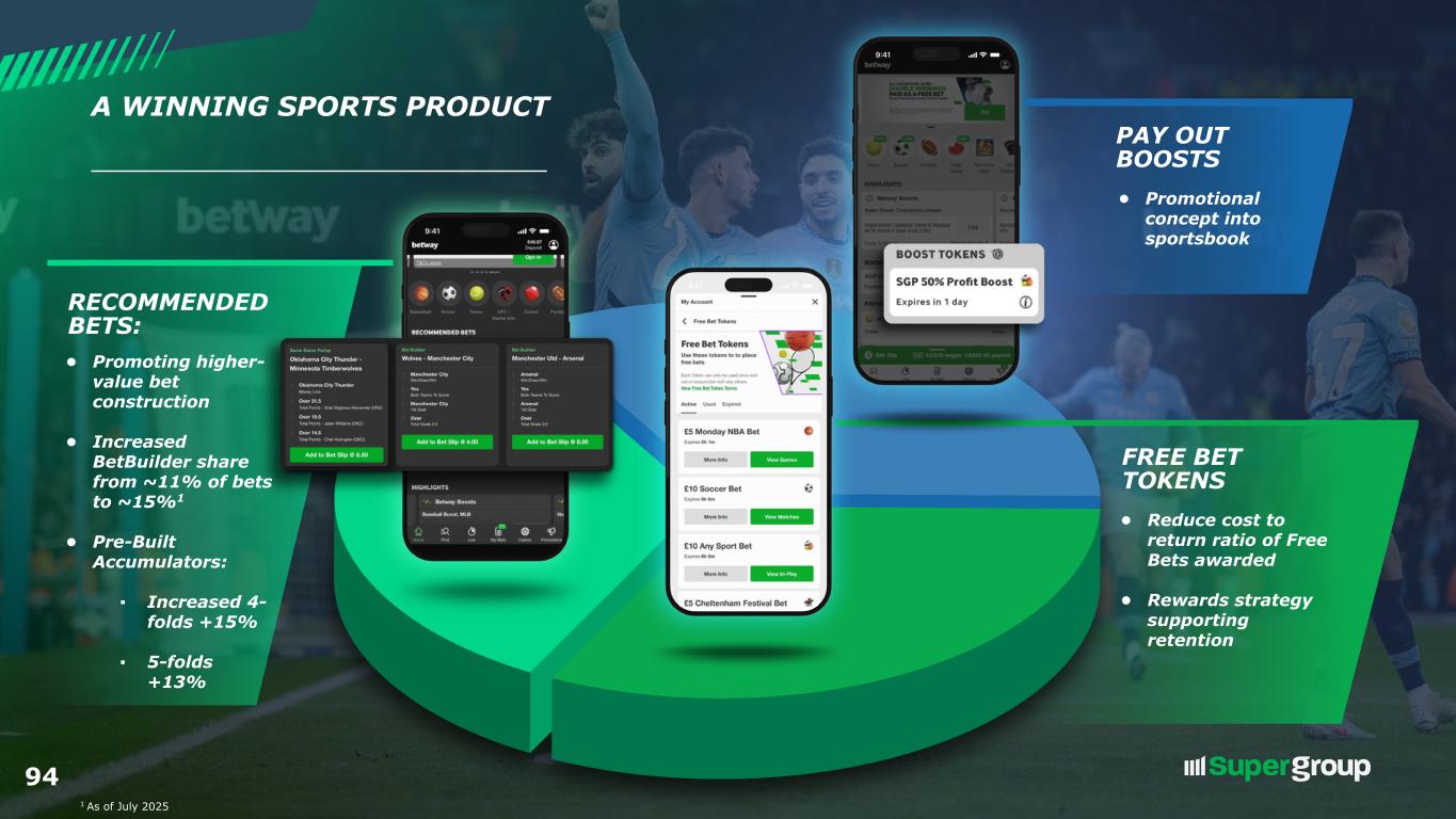 94 A WINNING SPORTS PRODUCT RECOMMENDED BETS: • Promoting higher- value bet construction • Increased BetBuilder share from ~11% of bets to ~15%1 • Pre-Built Accumulators: ▪ Increased 4- folds +15% ▪ 5-folds +13% PAY OUT BOOSTS • Promotional concept into sportsbook FREE BET TOKENS • Reduce cost to return ratio of Free Bets awarded • Rewards strategy supporting retention 1 As of July 2025