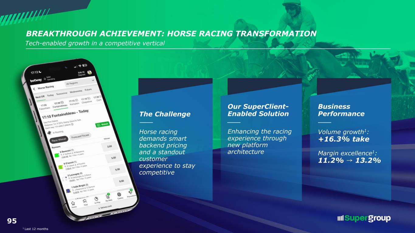 95 BREAKTHROUGH ACHIEVEMENT: HORSE RACING TRANSFORMATION The Challenge Horse racing demands smart backend pricing and a standout customer experience to stay competitive Our SuperClient- Enabled Solution Enhancing the racing experience through new platform architecture Business Performance Volume growth1: +16.3% take Margin excellence1: 11.2% → 13.2% Tech-enabled growth in a competitive vertical 1 Last 12 months