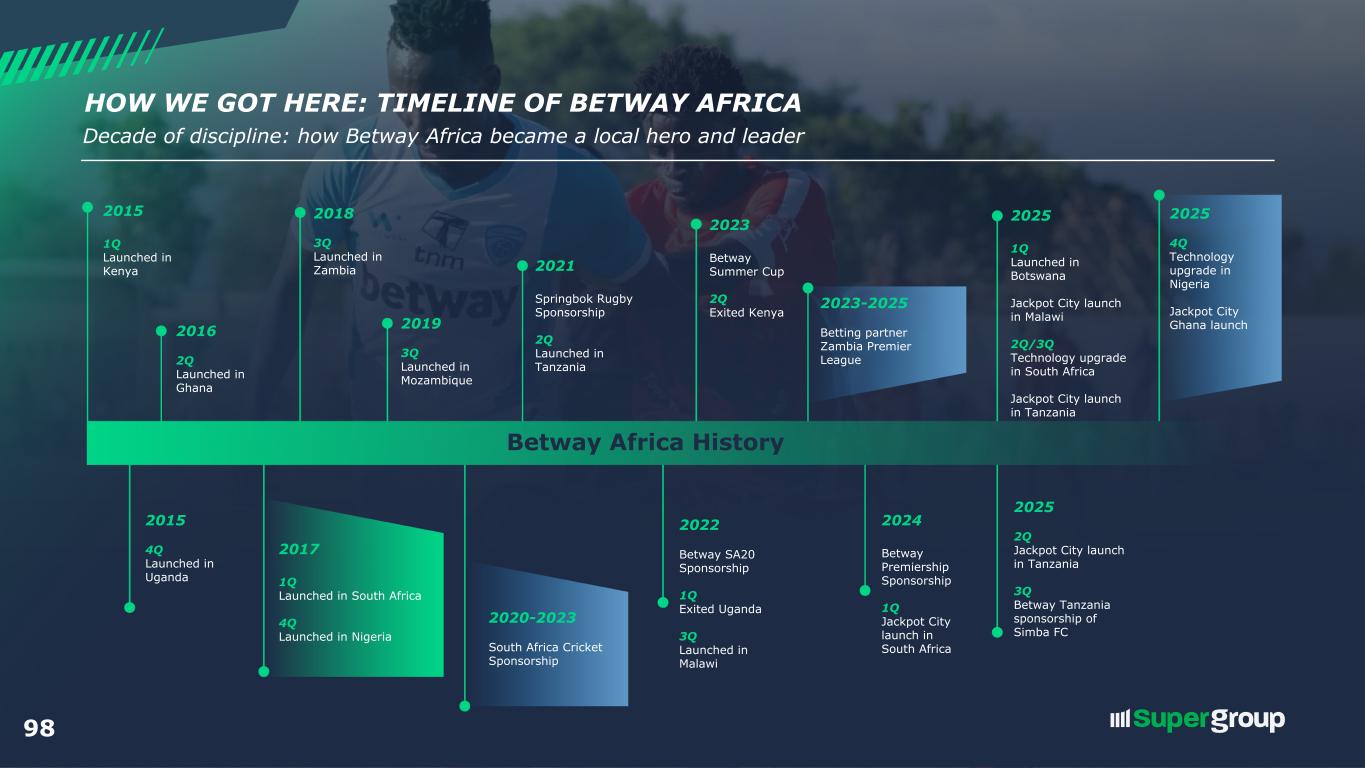 HOW WE GOT HERE: TIMELINE OF BETWAY AFRICA 98 2016 2Q Launched in Ghana 2018 3Q Launched in Zambia 2019 3Q Launched in Mozambique 2021 Springbok Rugby Sponsorship 2Q Launched in Tanzania 2023 Betway Summer Cup 2Q Exited Kenya 2023-2025 Betting partner Zambia Premier League 2025 1Q Launched in Botswana Jackpot City launch in Malawi 2Q/3Q Technology upgrade in South Africa Jackpot City launch in Tanzania 2025 4Q Technology upgrade in Nigeria Jackpot City Ghana launch 2015 4Q Launched in Uganda 2017 1Q Launched in South Africa 4Q Launched in Nigeria 2020-2023 South Africa Cricket Sponsorship 2022 Betway SA20 Sponsorship 1Q Exited Uganda 3Q Launched in Malawi 2024 Betway Premiership Sponsorship 1Q Jackpot City launch in South Africa 2025 2Q Jackpot City launch in Tanzania 3Q Betway Tanzania sponsorship of Simba FC Betway Africa History 2015 1Q Launched in Kenya Decade of discipline: how Betway Africa became a local hero and leader