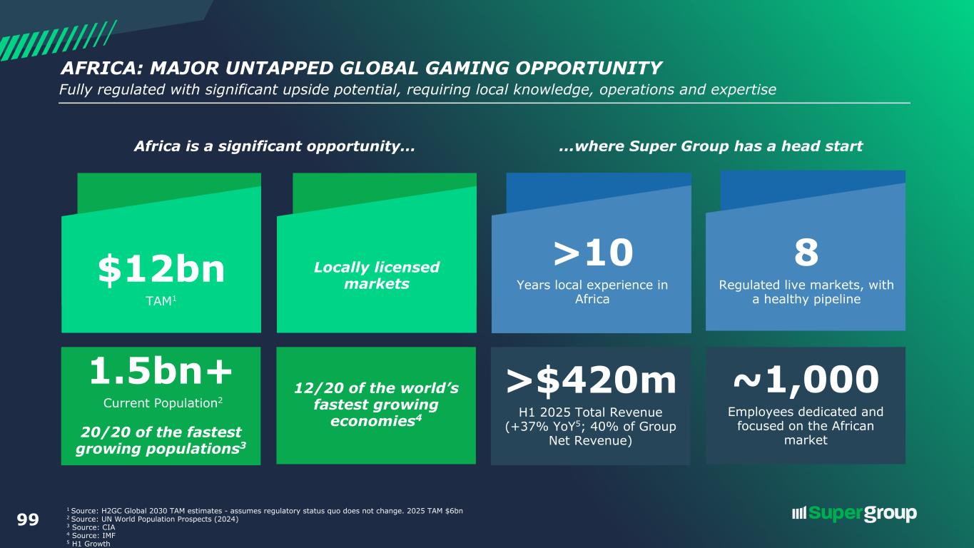 1 Source: H2GC Global 2030 TAM estimates - assumes regulatory status quo does not change. 2025 TAM $6bn 2 Source: UN World Population Prospects (2024) 3 Source: CIA 4 Source: IMF 5 H1 Growth Fully regulated with significant upside potential, requiring local knowledge, operations and expertise Africa is a significant opportunity... ...where Super Group has a head start $12bn TAM1 Locally licensed markets 1.5bn+ Current Population2 20/20 of the fastest growing populations3 12/20 of the world’s fastest growing economies4 ~1,000 Employees dedicated and focused on the African market >$420m H1 2025 Total Revenue (+37% YoY5; 40% of Group Net Revenue) AFRICA: MAJOR UNTAPPED GLOBAL GAMING OPPORTUNITY 8 Regulated live markets, with a healthy pipeline >10 Years local experience in Africa 99
